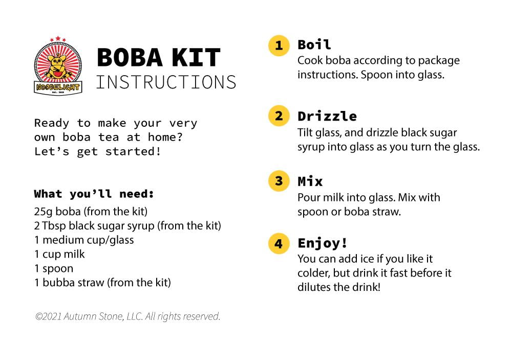 Enjoy boba at home! Make your own boba drink at home with this kit and milk from the fridge! What’s included – 1 pack of Wu Fu Yuan boba (250g) – 1 bottle Nok Cha Won black sugar syrup (600g) – 10 boba straws Yield Makes 10 boba drinksmilk, tea, sugar, brownsugar, tapioca, boba, tapiocapearls, bubbletea, bubble, kit, syrup, blacktea, pearls