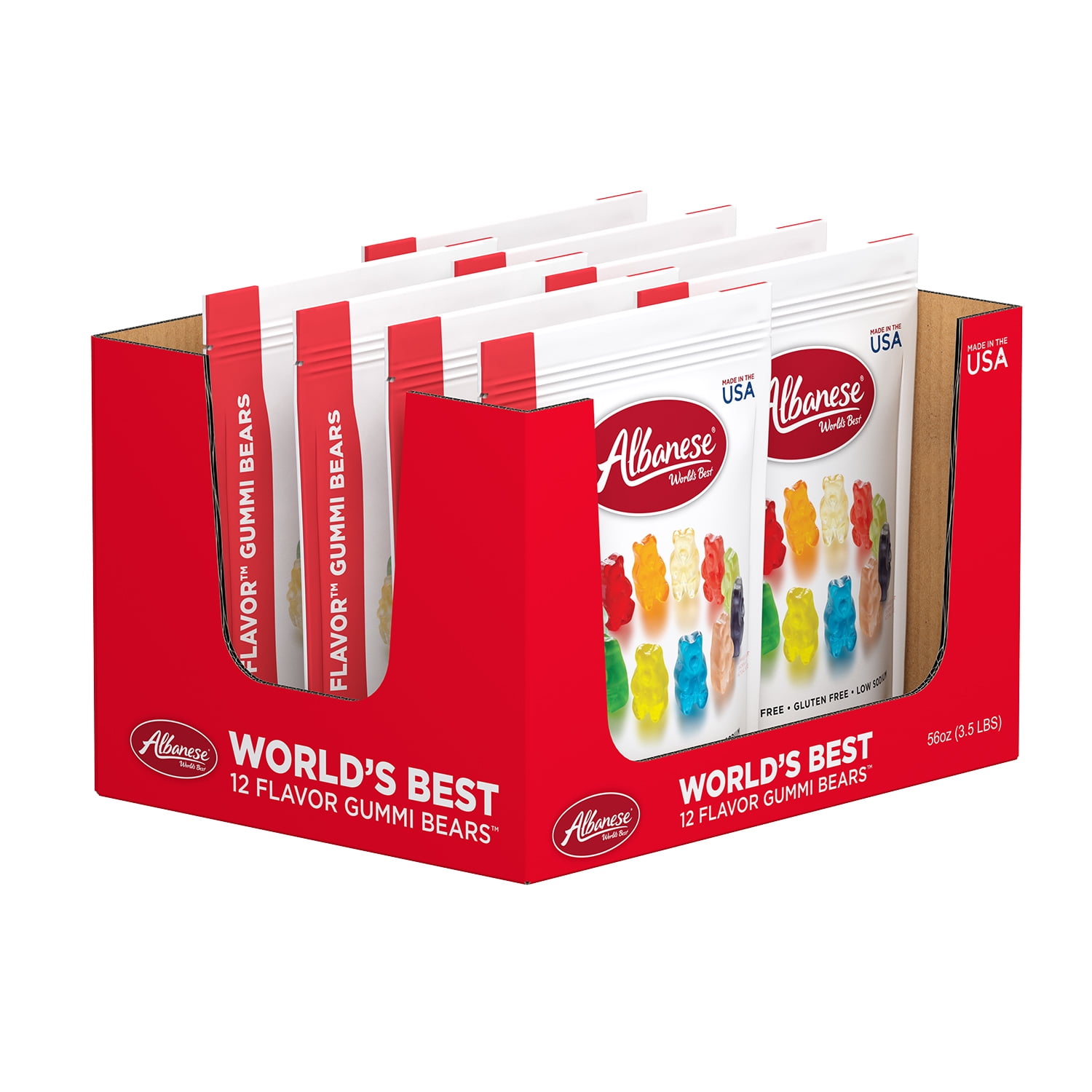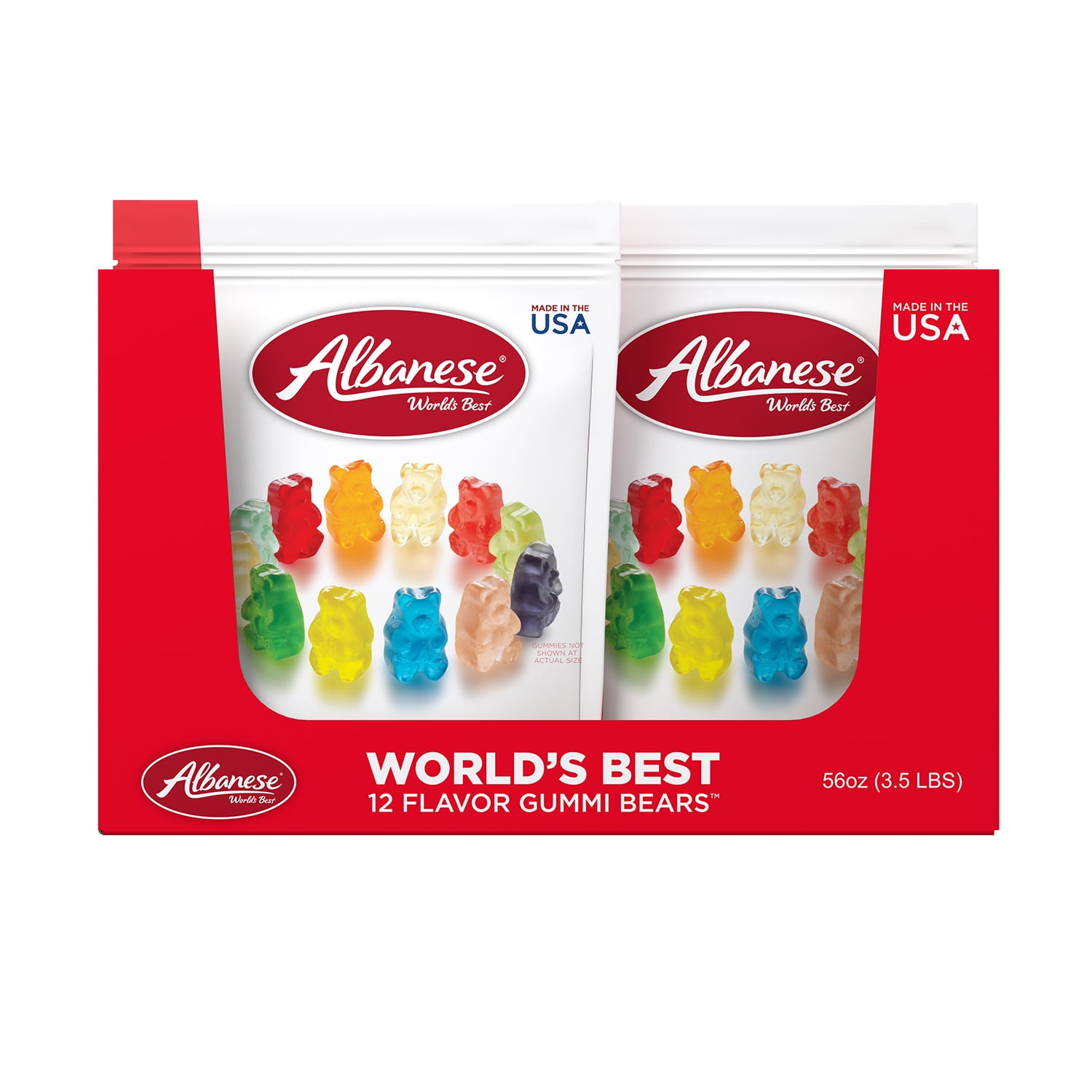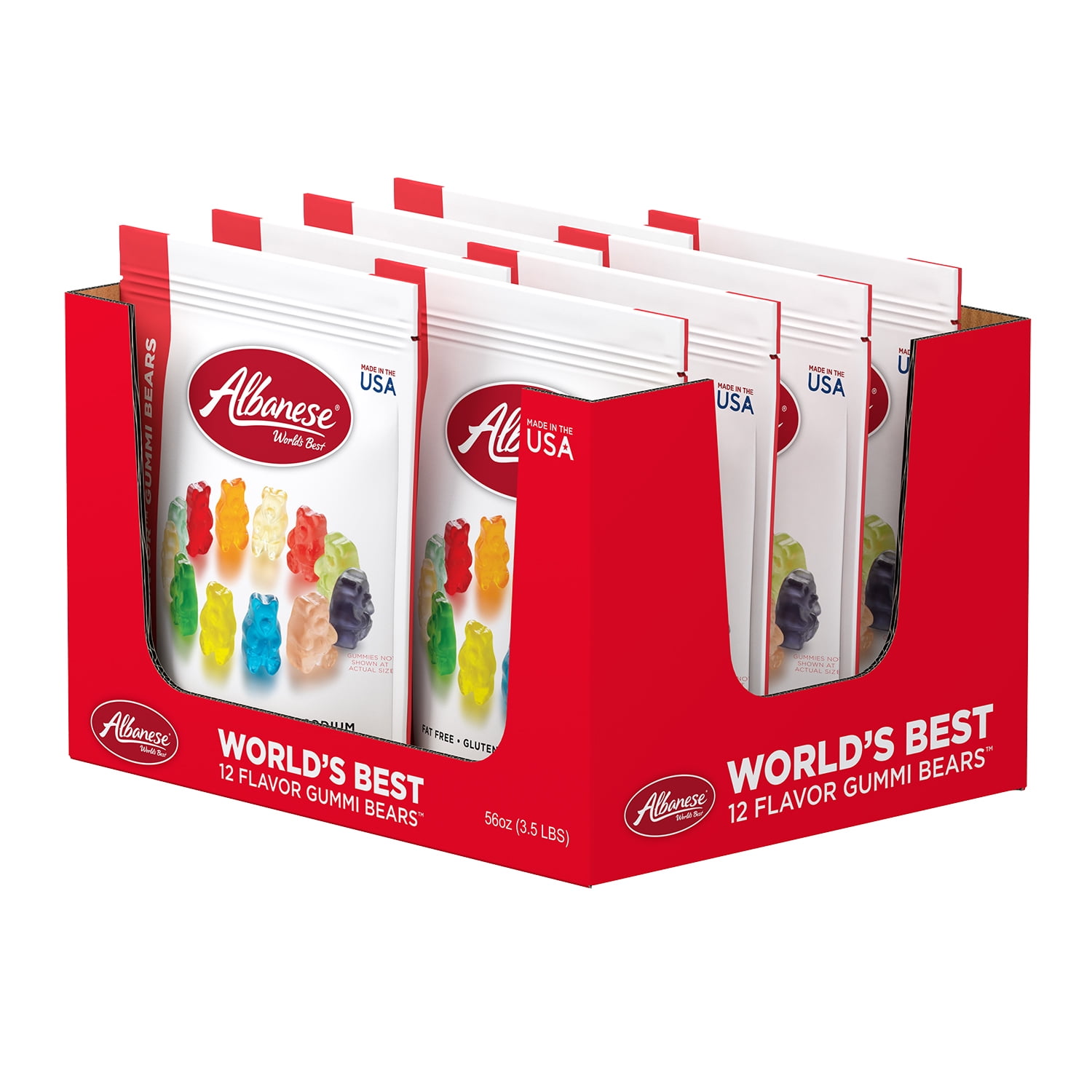 Albanese Confectionery Group calls their 12 Flavor Gummies the World’s Best Gummies. Sourcing the best available ingredients, Albanese makes the gummi bears right here in the USA. You can taste the difference from the first soft and chewy bite. The juicy flavors come in 12 options: Cherry, Pink Grapefruit, Watermelon, Strawberry, Orange, Blue Raspberry, Lime, Grape, Green Apple, Mango, Pineapple, and Lemon. Whether you spell it gummi bears or gummy bears, remember there is only one way to spell World’s Best –