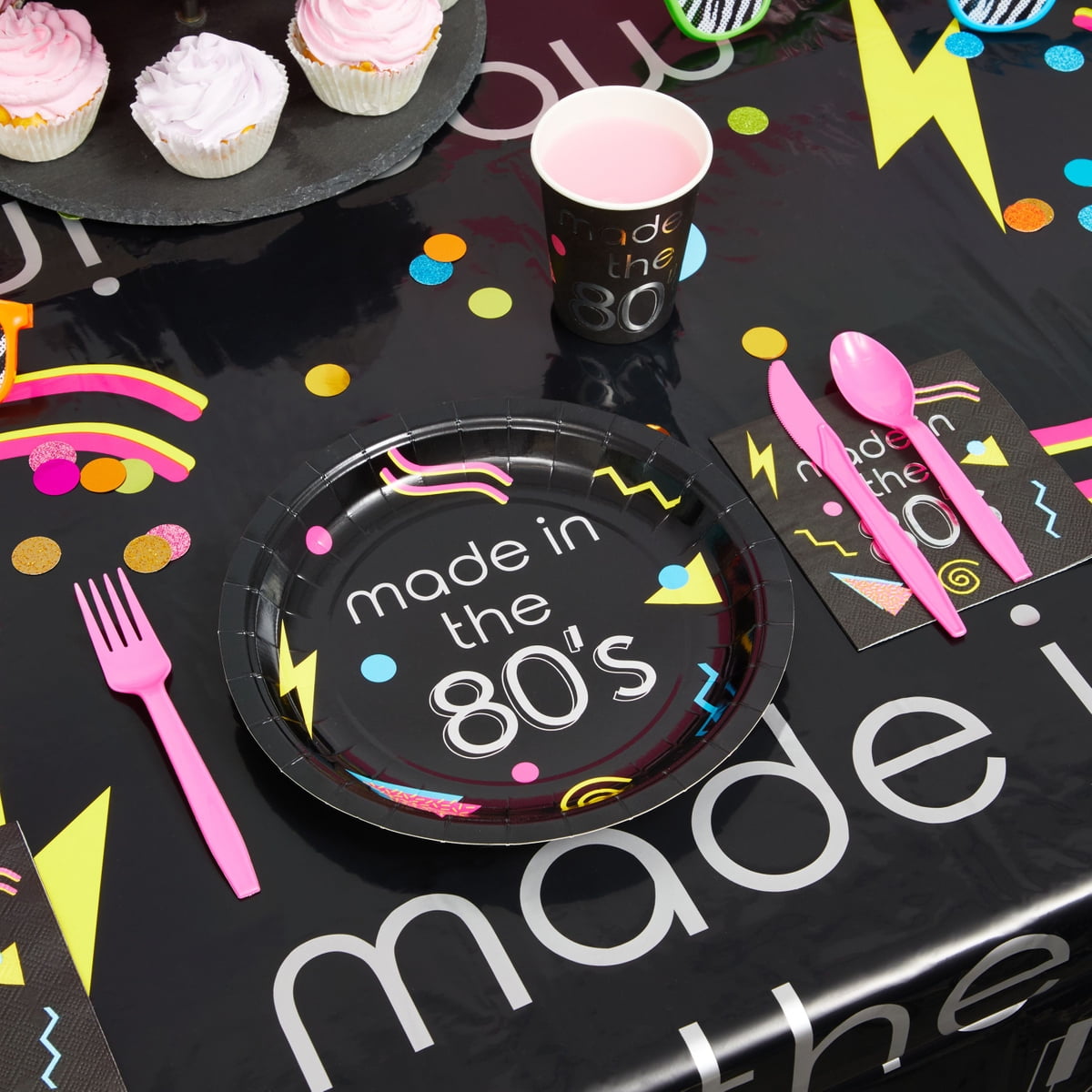 - Quick and Easy Clean-Up: No need to stop the fun to clean up, the table cover, banner, 80’s theme plates, napkins, cups, and plastic silverware can easily be disposed of after use