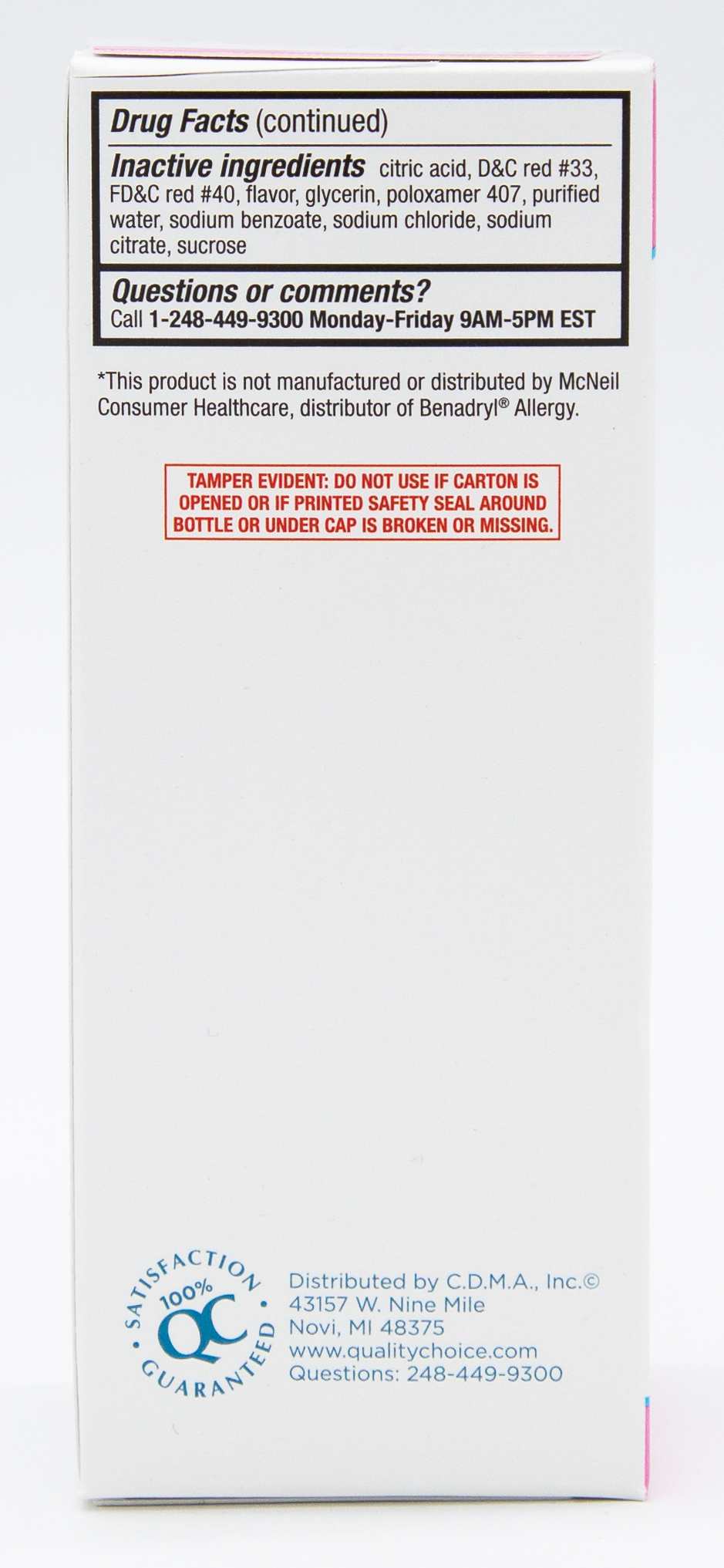 Quality Choice Children’s Allergy Oral Solution is a Diphenhydramine HCI Antihistamine for ages 6 to 11, temporarily relieving the symptoms due to hay fever or other upper respiratory allergies: sneezing, runny nose, itchy, watery eyes, or itching of the nose or throat. Quality Choice Children’s Allergy medicine is alcohol free, making it safe for children, with a bubblegum flavor that they enjoy. Compare the Active Ingredient to that of any other leading brand liquid children’s antihistamine medicine. 4 fl. oz. per container. From Quality Choice, the Brand You Trust. Quality Choice for a Quality Life.