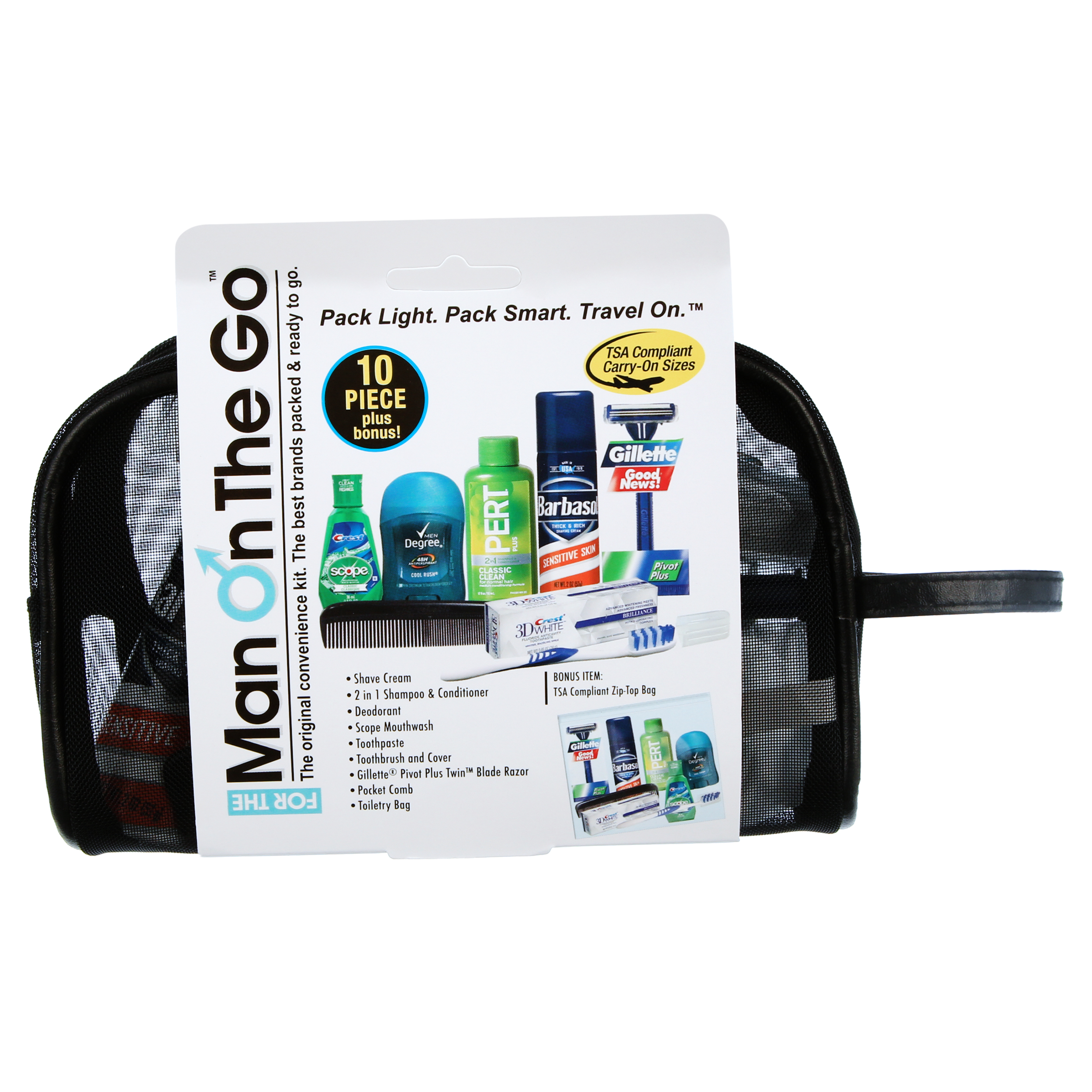 - Barbasol Shave Cream 2.85 oz, Pert Plus 2in1 Shampoo+Conditioner1.7 oz., Degree for Men A/P Deodorant .5 oz, Scope Mouthwash 1.22 oz, Crest Toothpaste .85 oz, Toothbrush, Comb, Gillette Good News Razor, Travel Guide, TSA Compliant Quart Size Zip Top Bag in Black Mesh Bag.