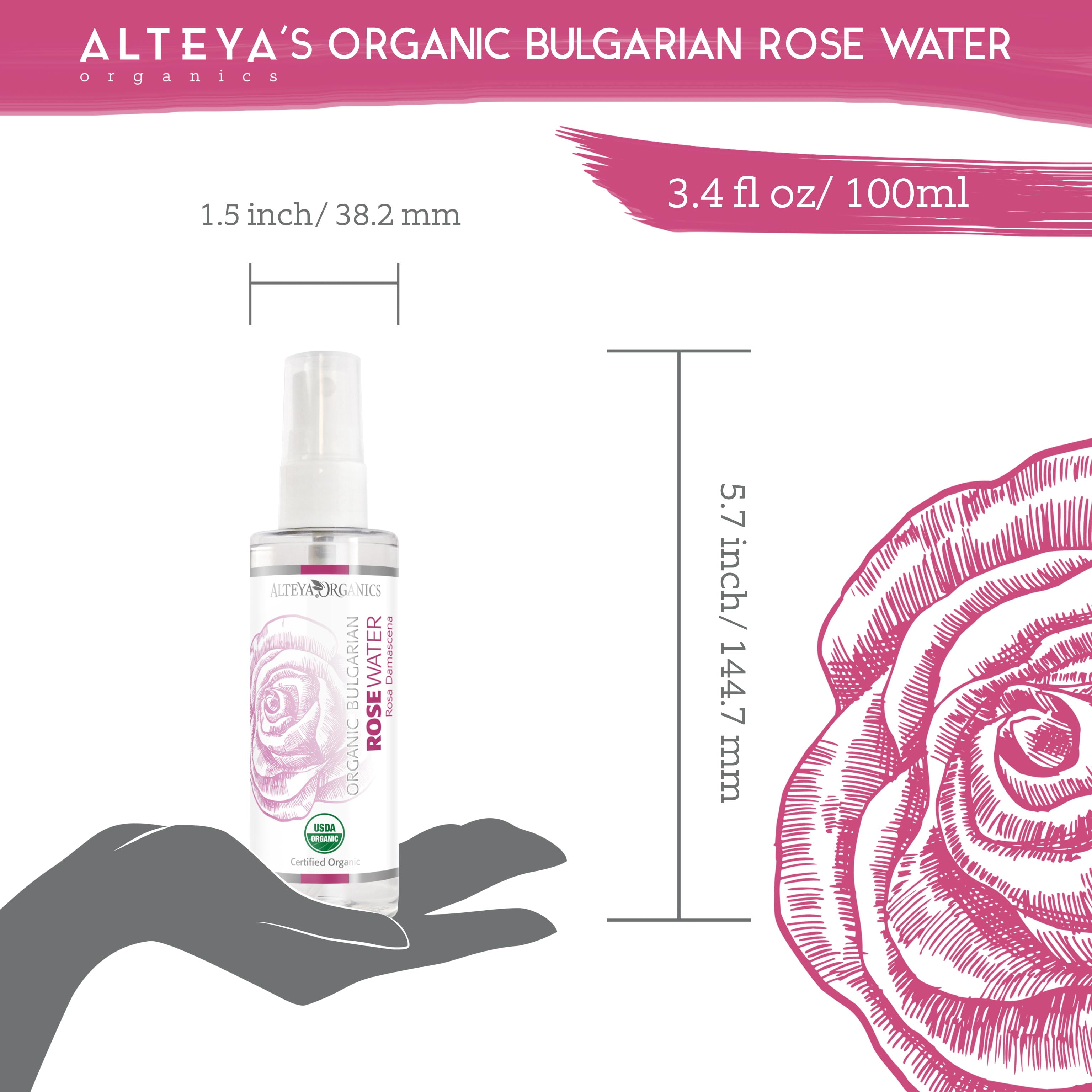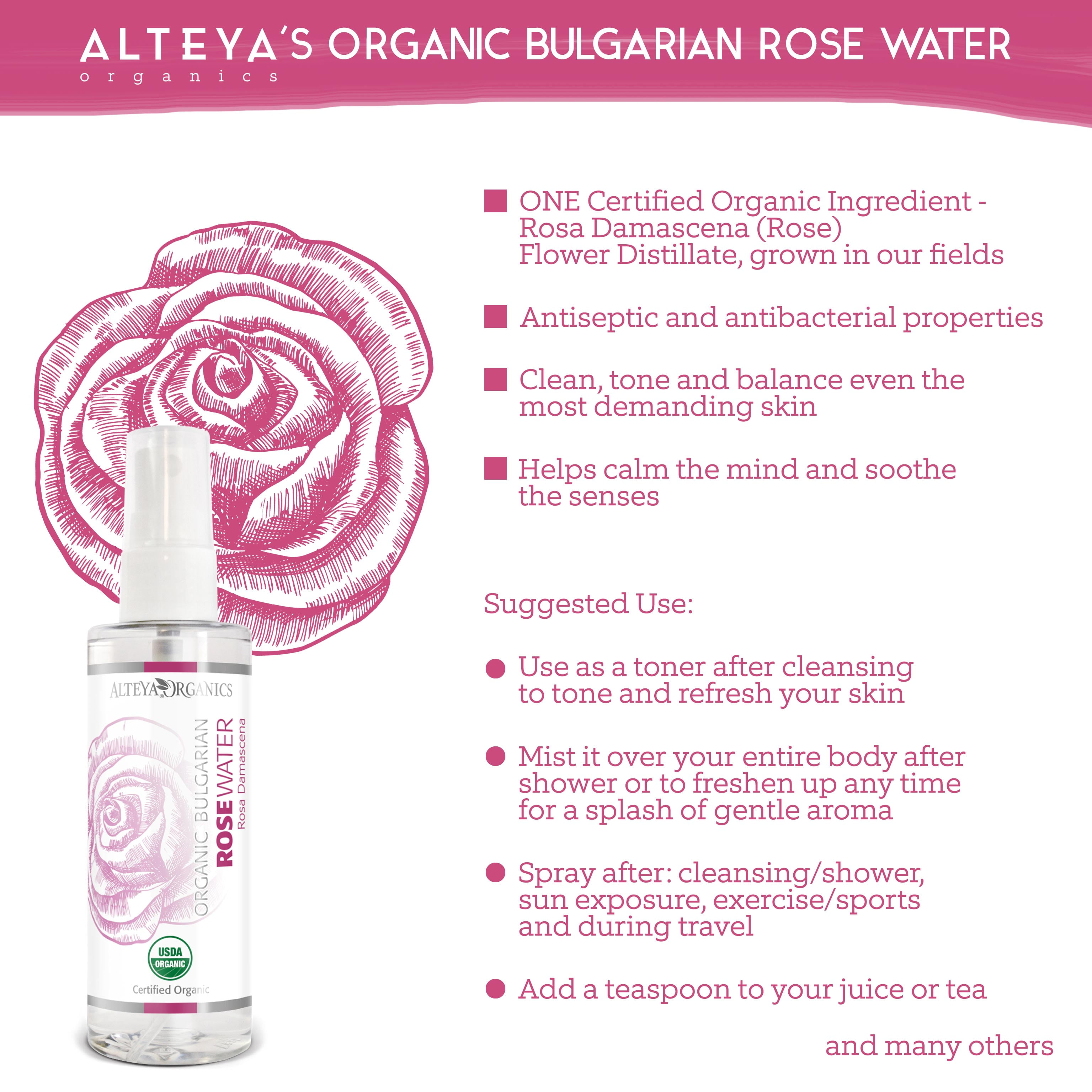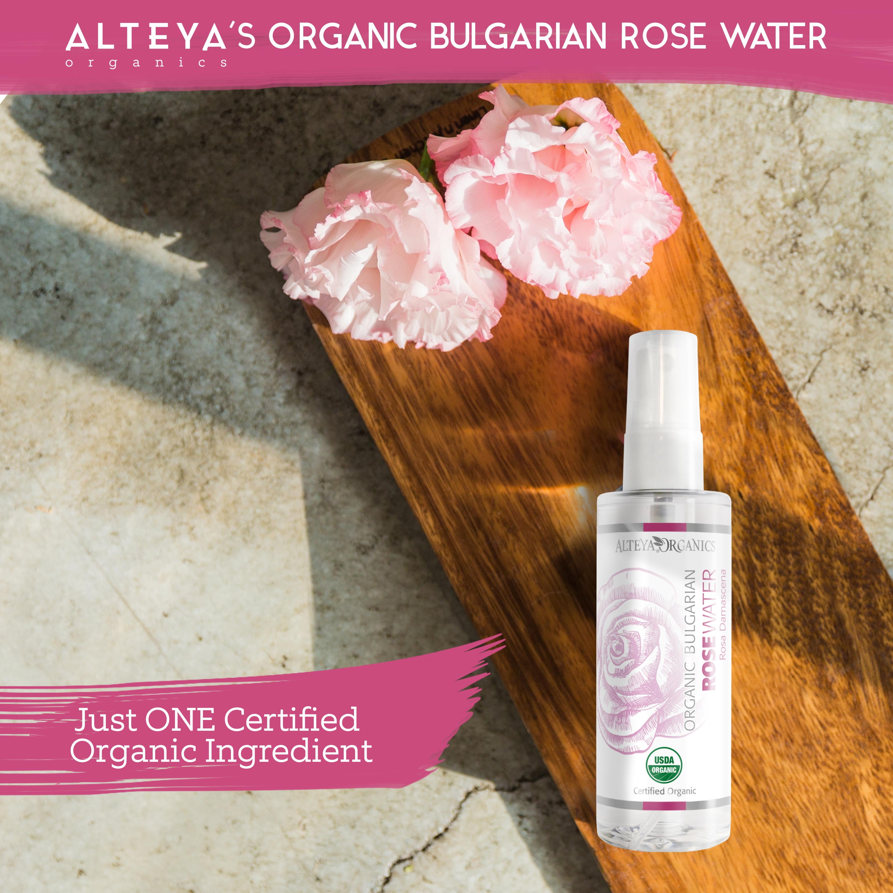 Alteya Organics Pure Organic Rose Water is Therapeutic and Food Grade product. By using a unique distillation technique, which embodies century-old traditions and modern technology, we distill a special grade rose water that completely preserves the synergy of the rose plant.100% organically grown and ethically harvested from our family rose farm in the heart of the Bulgarian Rose Valley.