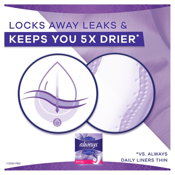 For light days or as back up for period leaks, try Always Xtra Protection Daily Liners Extra Long for all-day comfort. These pantiliners keep you five times drier* thanks to a LeakGuard Core and RapidDry protection. With their super soft material, Always Xtra Protection Daily Liners Extra Long are comfortable to wear every day of the month. *vs. Always Thin Daily LinersAlways Xtra Protection Extra Long Daily Liners, 92 ct:Always Xtra Protection Daily Liners protect with LeakGuard Core + RapidDry to help keep you 5X drier (vs. Always Thin Daily Liners)Ideal for light days, tampon back up or daily freshnessDual layer design with absorbing core locks away leaksEdge-2-Edge Adhesive helps keep the panty liner in placeAlways’ best coverage pantiliners with 25% more coverage (vs. Always Xtra Protection Daily Liners Regular)Always pantiliners give you the level of protection that’s right for youAlways Xtra Protection Extra Long Daily Liners, 92 ct | 2 Packs – 184 counts total