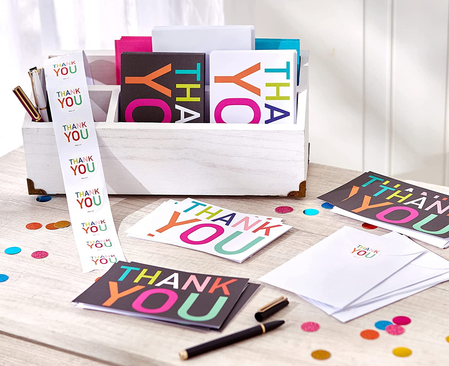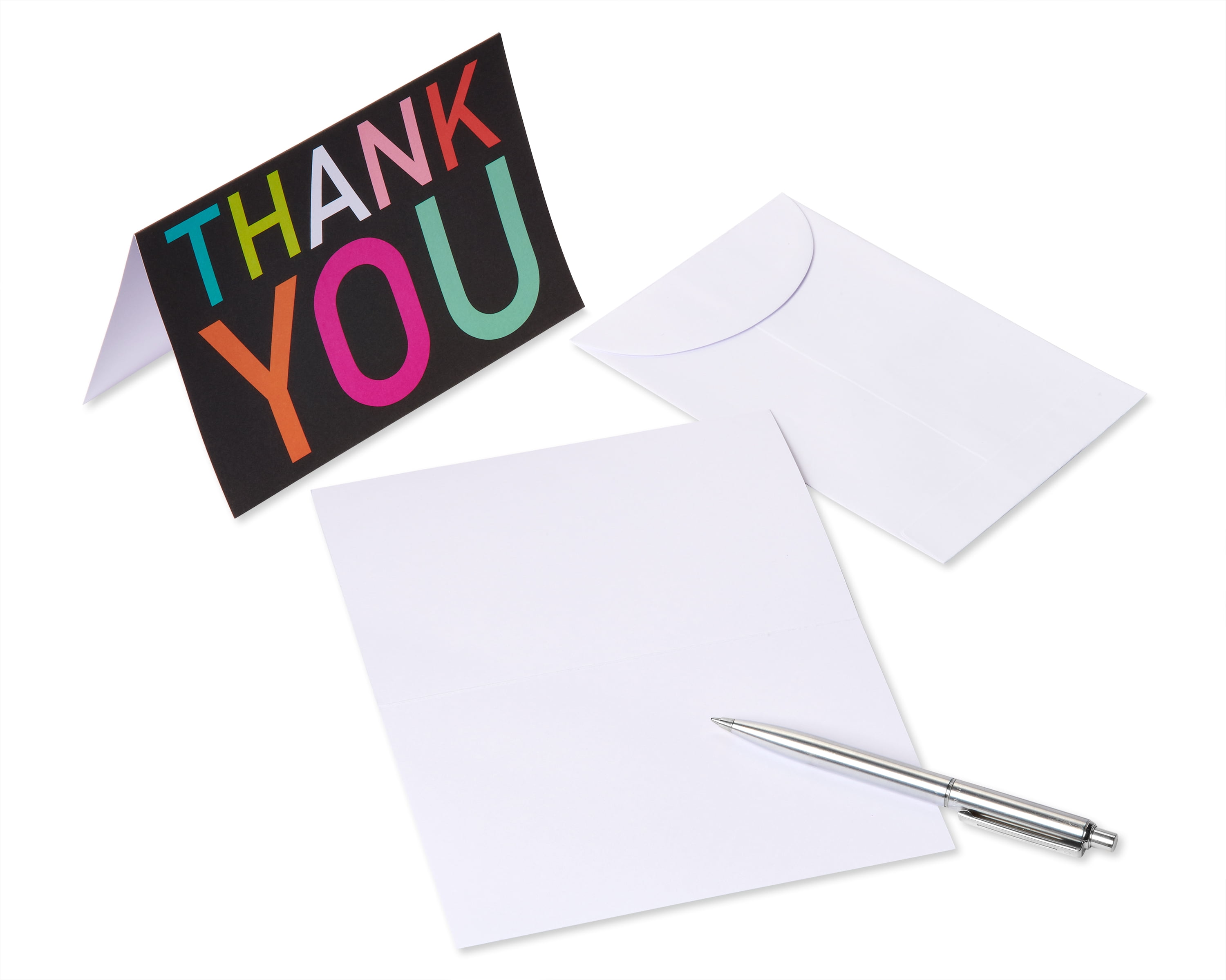 Whenever you feel grateful, share a bright thank-you from American Greetings! This 48-count bulk card package features “Thank You” in rainbow lettering – with 24 cards on a dramatic black background, and 24 cards on a bright white background. Blank space inside the card to write your personalized message of appreciation. Neatly packaged in a protective acetate box, this generous bulk pack of 48 cards and 2 designs with white envelopes provides a great value. When the moment calls for gratitude, you’ll be glad to have the perfect cards at your fingertips!