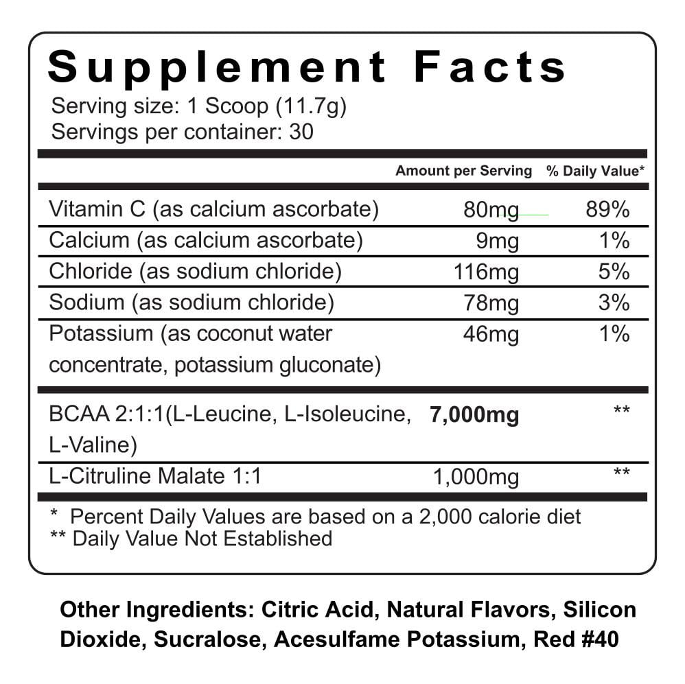 All-Day Muscle Building, Hydrating Supplement That Will Keep You Going Psycho Every Workout. Flood your muscles with hydrating coconut water, boost nitric oxide and energy levels, replenish crucial electrolytes, and fuel massive gains with this easy mixing powder that tastes amazing enough to sip all day! We made hydration and recovery simple. NO STIMULANTS. To improve results, add a scoop and mix with Edge Of Insanity pre workout! How to use: 7 g BCAAs with hydration matrix in every scoop good for before during and after a workout. We should consume two scoops worth per day. “Burn BCAAs not muscle”All-Day Muscle Building, Hydrating Supplement That Will Keep You Going Psycho Every Workout.Flood your muscles with hydrating coconut water, boost nitric oxide and energy levels, replenish crucial electrolytes, and fuel massive gains with this easy mixing powder that tastes amazing enough to sip all