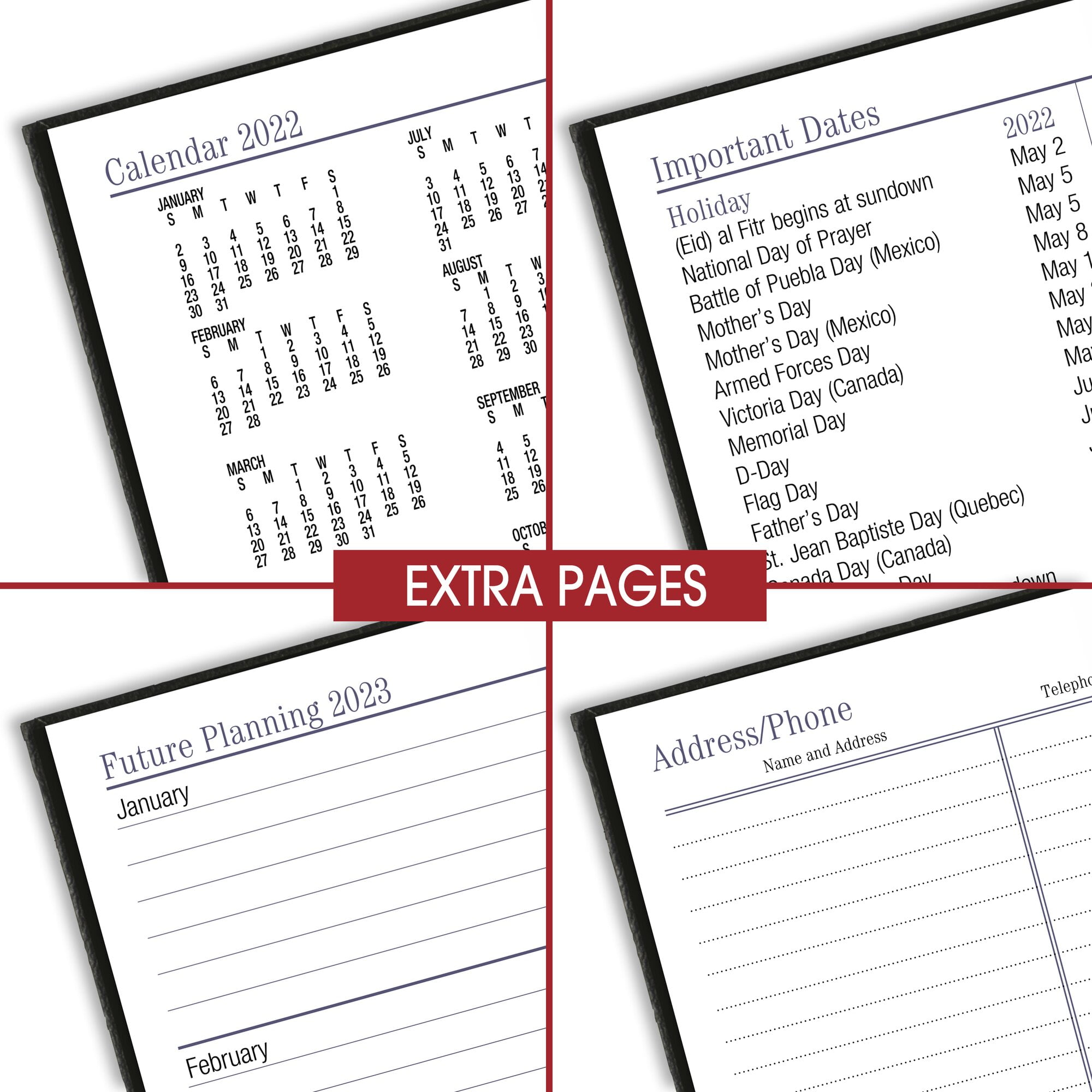 - Bonus pages include future year planning, telephone/address pages and reference pages