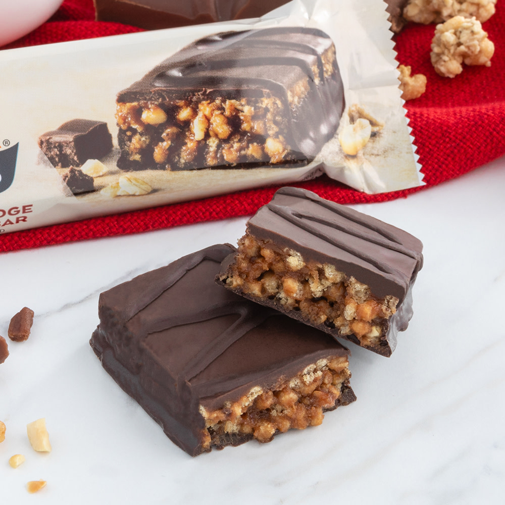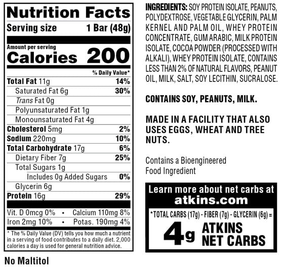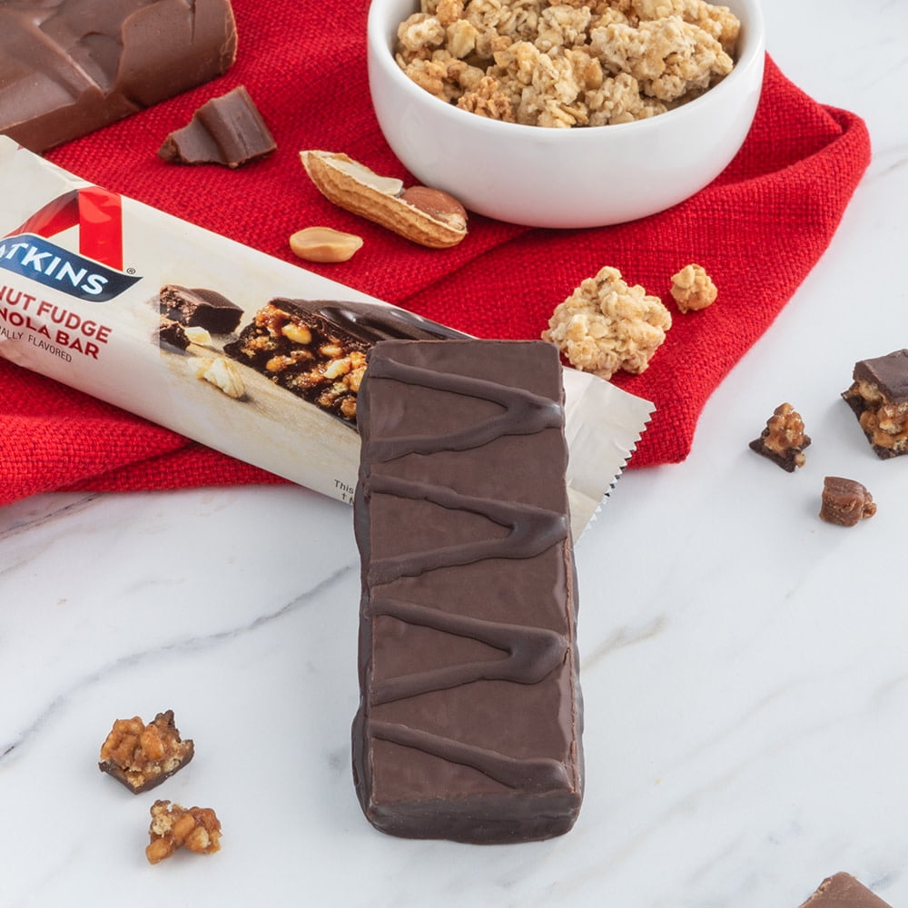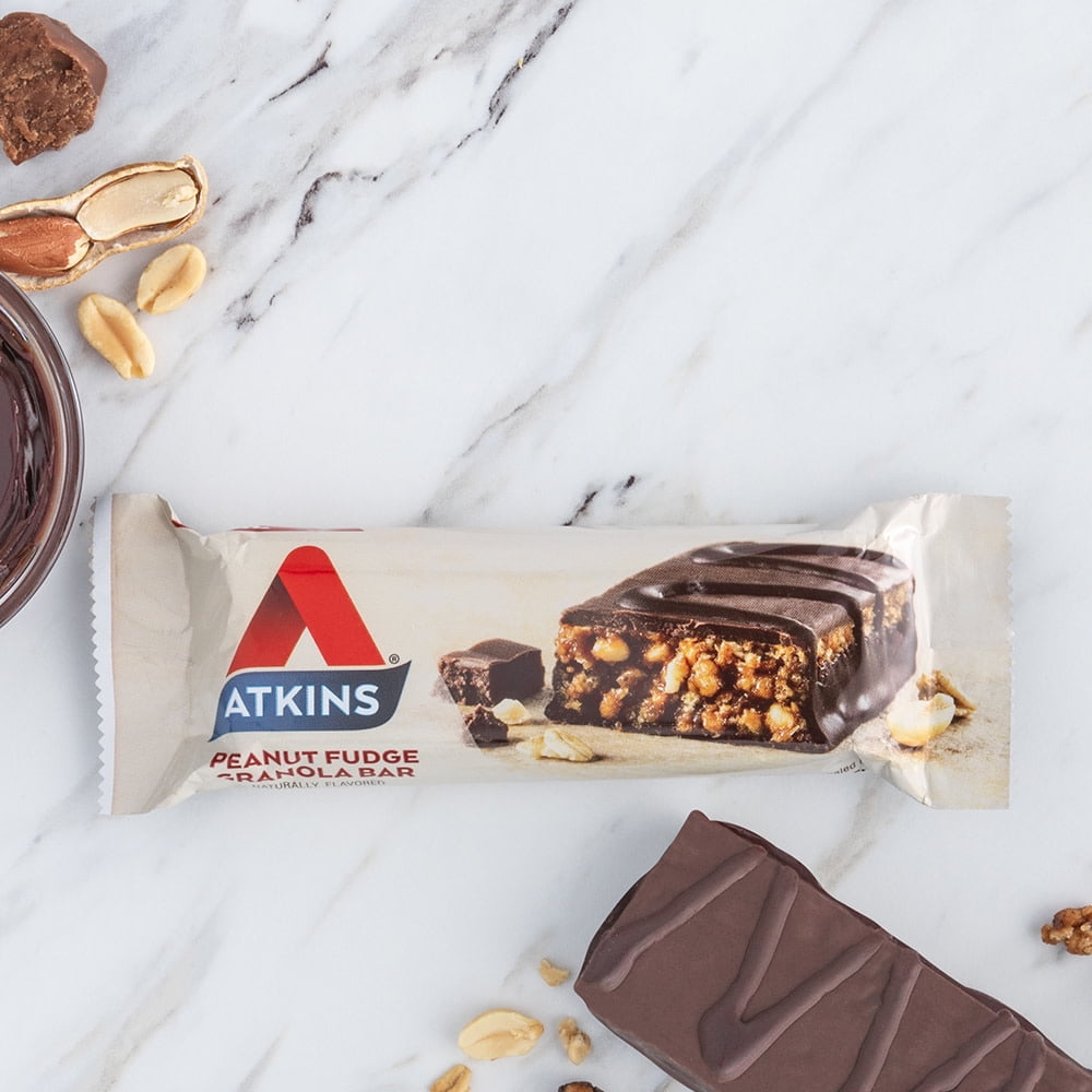 - STAY ON TRACK. Stay true the Atkins Diet and Lifestyle with our keto-friendly* meal bars. This Peanut Fudge Granola flavor bar has 4 grams of net carbs and 1 gram of sugar per serving. *When used with Atkins ketogenic programs
