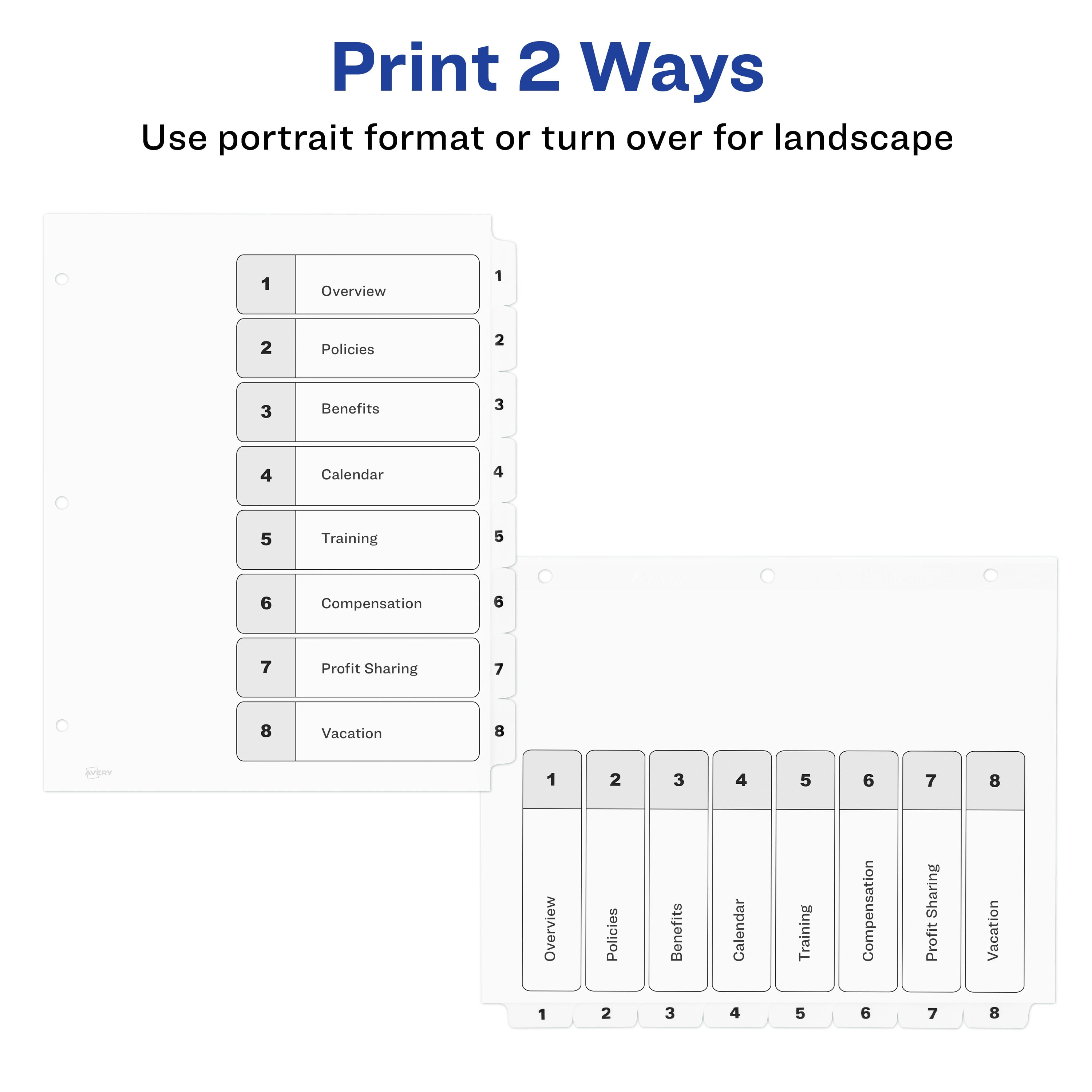 Organize your projects in moments with Avery Ready Index binder dividers. Each white tab is preprinted for a professional appearance. Print your own custom section titles and images onto the table of contents sheet without worrying about labels or inserts. Whether you’re creating planners for classes or hosting a presentation, these dividers are ideal for getting everything sorted. 1 set of 8 dividers are included with each sheet measuring 8-1/2"x11". The 3 binder holes are reinforced on both sides of the heavyweight sheet to prevent creasing and tearing. Each divider tab includes additional reinforcement along the edge of each page to distribute stress and resist folding. The printable table of contents is dual compatible with both laser and inkjet printers. This sheet can also be printed in either portrait or landscape so that your projects can be displayed in any orientation. Just flip the sheet to view the other layout on the opposite side. Try out free templates for these dividers and check out the Avery Design & Print software at avery.com/templates.