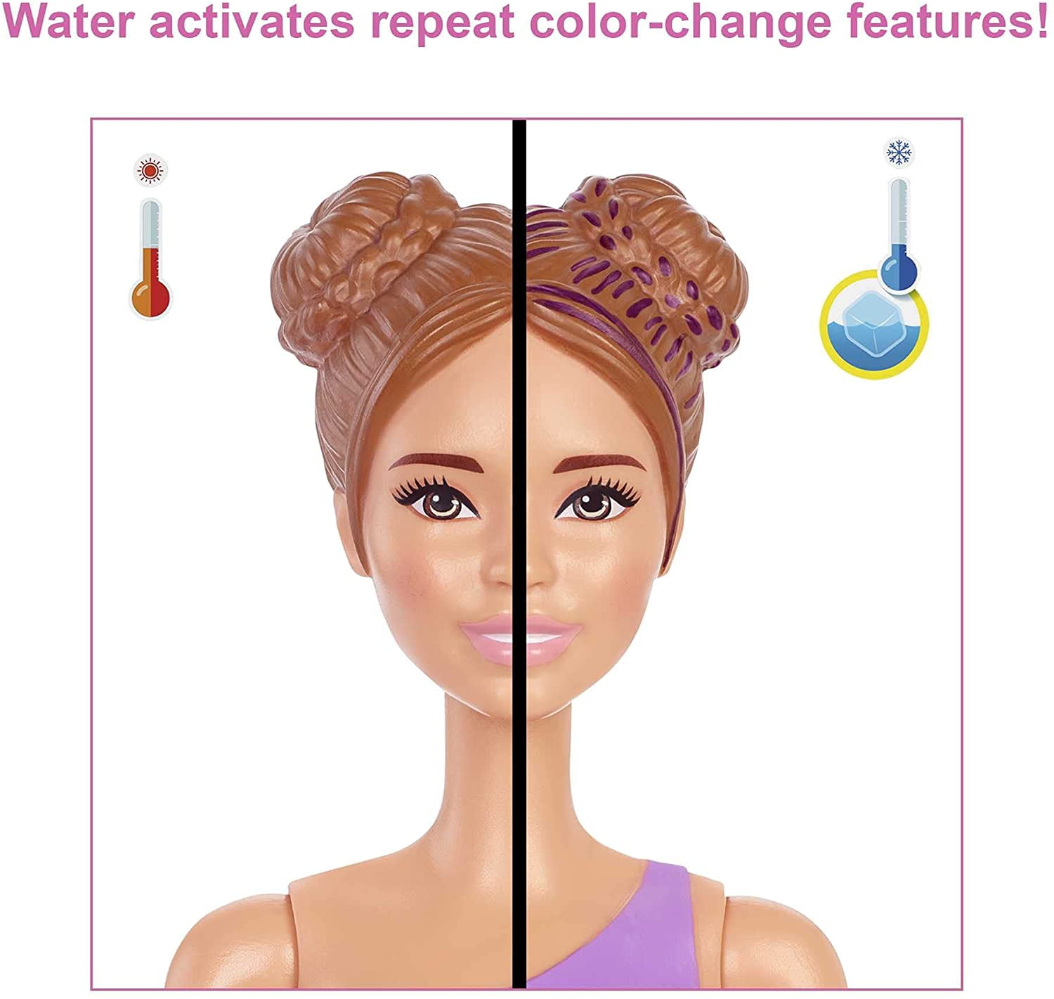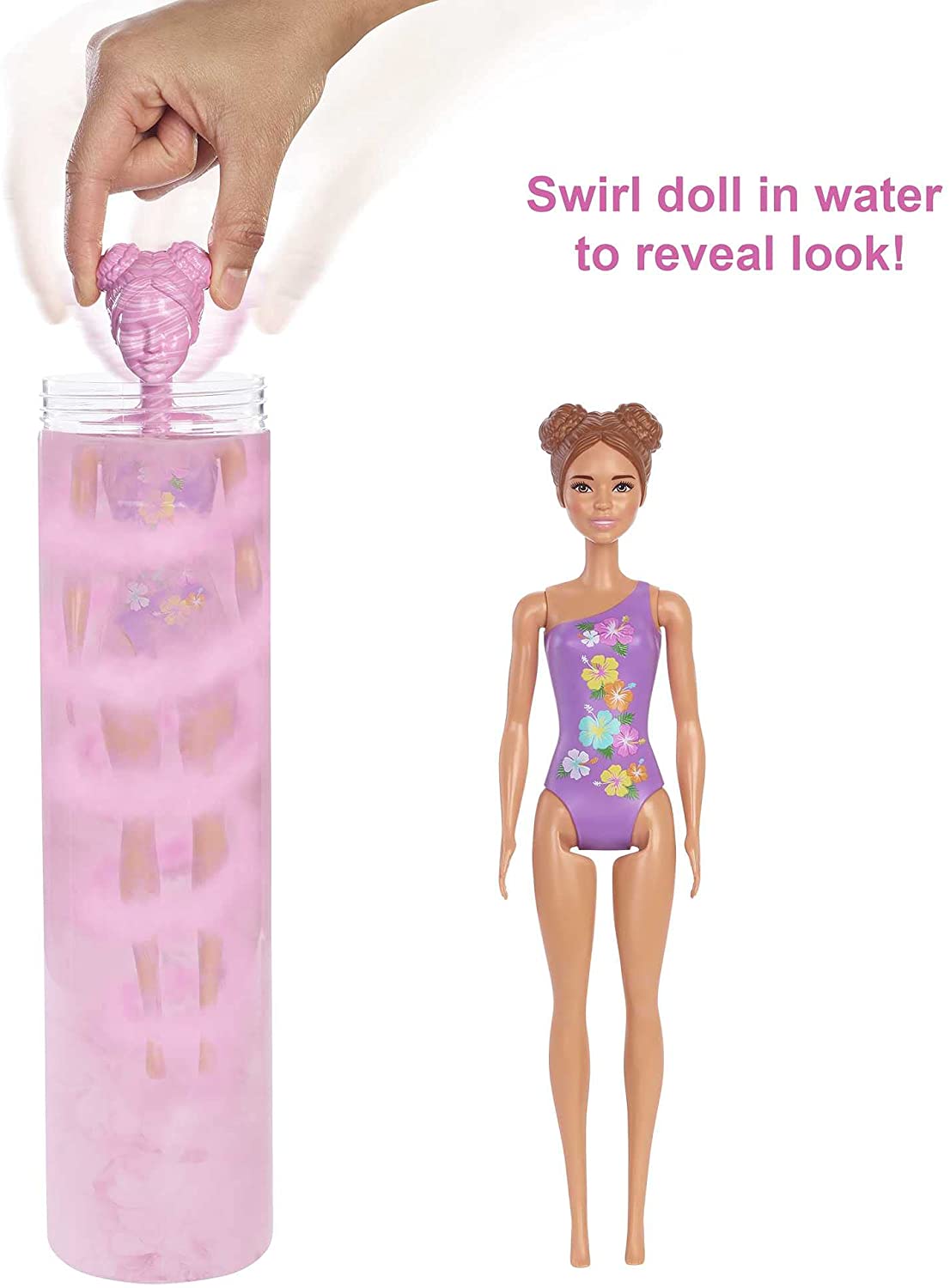 With 7 surprises in 1 package, the Barbie Color Reveal dolls deliver all kinds of delight -kids will love revealing the Party Series! Start the reveal experience by removing the outer layer of packaging, unscrewing the top of the tube and pulling out a doll partly covered in Color Reveal metallic silver with a confetti-print coating, and 4 decorated bags that keep the contents hidden! Fill the tube with warm water, place the doll inside and swirl her around -the water turns a metallic silvery color for a magical effect! Pull out the doll to reveal her look -each doll has a different combination of eye color, skin tone, sparkly bodice, hairstyle and colorful glitter-molded legs. âOpen the 4 mystery bags to reveal their surprises — a sheer print cover-up or sarong, pair of shoes, towel and sun-themed accessory, like a pair of sunglasses or visor; store them in the tube after play! âUse ice-cold water for a color-change transformation that can be repeated over and over again — change the doll’s hair color and transform her accessory! âDress and accessorize the doll to play out beach, pool, BBQ and other fun-in-the-sun stories — transform her look for a wow moment! âMakes a great gift for kids 3 to 9 years old, who can collect them to mix and match accessories and expand the playtime opportunities!Barbie Color Reveal Doll with 7 Surprises: 4 Mystery Bags, Shoes, Towel & Accessory; Water Reveals Marble Pink Dollâs Beach Look & Color Change on Hair & Accessory; Sand & Sun Series