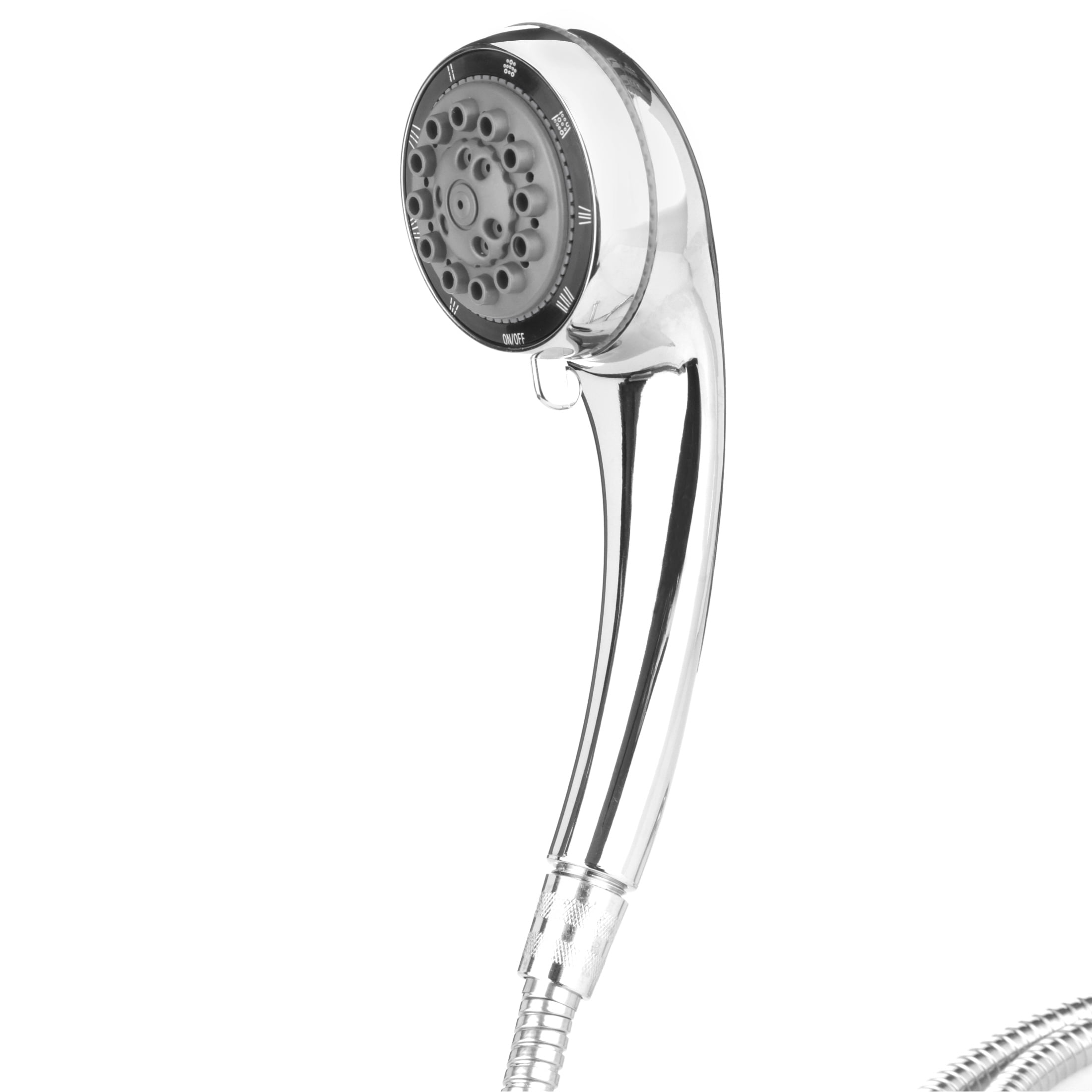 Bath Bliss Eight Function Shower Head with eight settings for optimal and various types of use in one convenient shower head. The Eight Function Shower Head Includes Spray, Mixed Spray, Pulse, Mixed Pulse, Massage, Rain, Mixed and On/Off. Shower Head comes with a 60-inch polished stainless steel no tangle hose, one shower wand, and one stainless steel mounting bracket and a 1-meter roll of Teflon tape. Hose contains brass fittings on each end to ensure a secure fit. Shower head contains a push button at base of head for easy access to switch between each of the available settings.