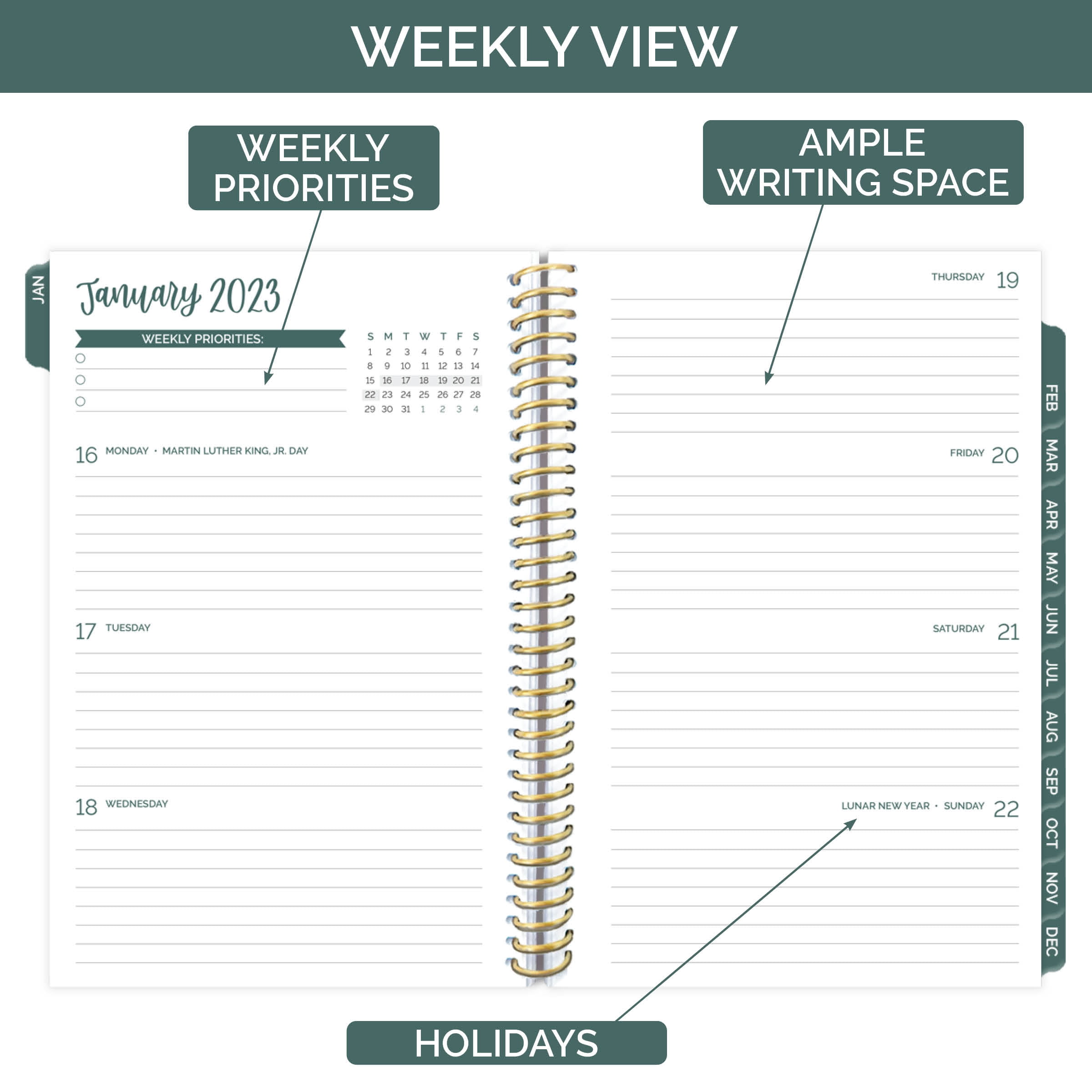 - Spacious 12 monthly & weekly views run from January 2023 through December 2023