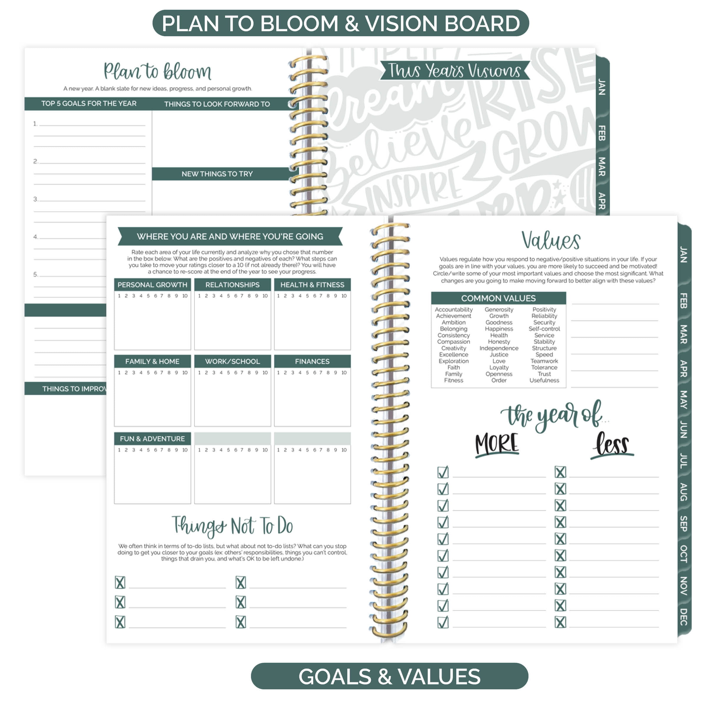 - More than just a planner! This planner is packed with life coaching worksheets and inspirational features to help you set and achieve all of your goals for the year including: Personal info page with a yearly mission statement & word of the year prompt, 2023 yearly overview, goal setting, vision board, life auditing page, values page, goal tracking, monthly habit & task tracking, ideal week planning worksheet, weekly scheduling template, monthly spending & bill tracking, joy & affirmations list, now 13 notes pages, monthly highlights page, important dates for next year, year in review, monthly challenges, inspirational quotes & more