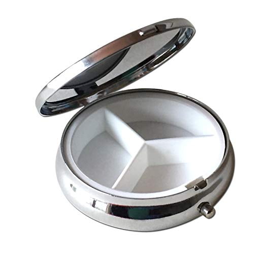 This round silver three compartment pill box is lightweight and sleek enough to fit nicely into your pocket or purse or to use as a travel case. Sturdy metal construction with plastic inside divider. 50 mm/2 Inch Diameter.California Brown Bear Travel Pill Case
