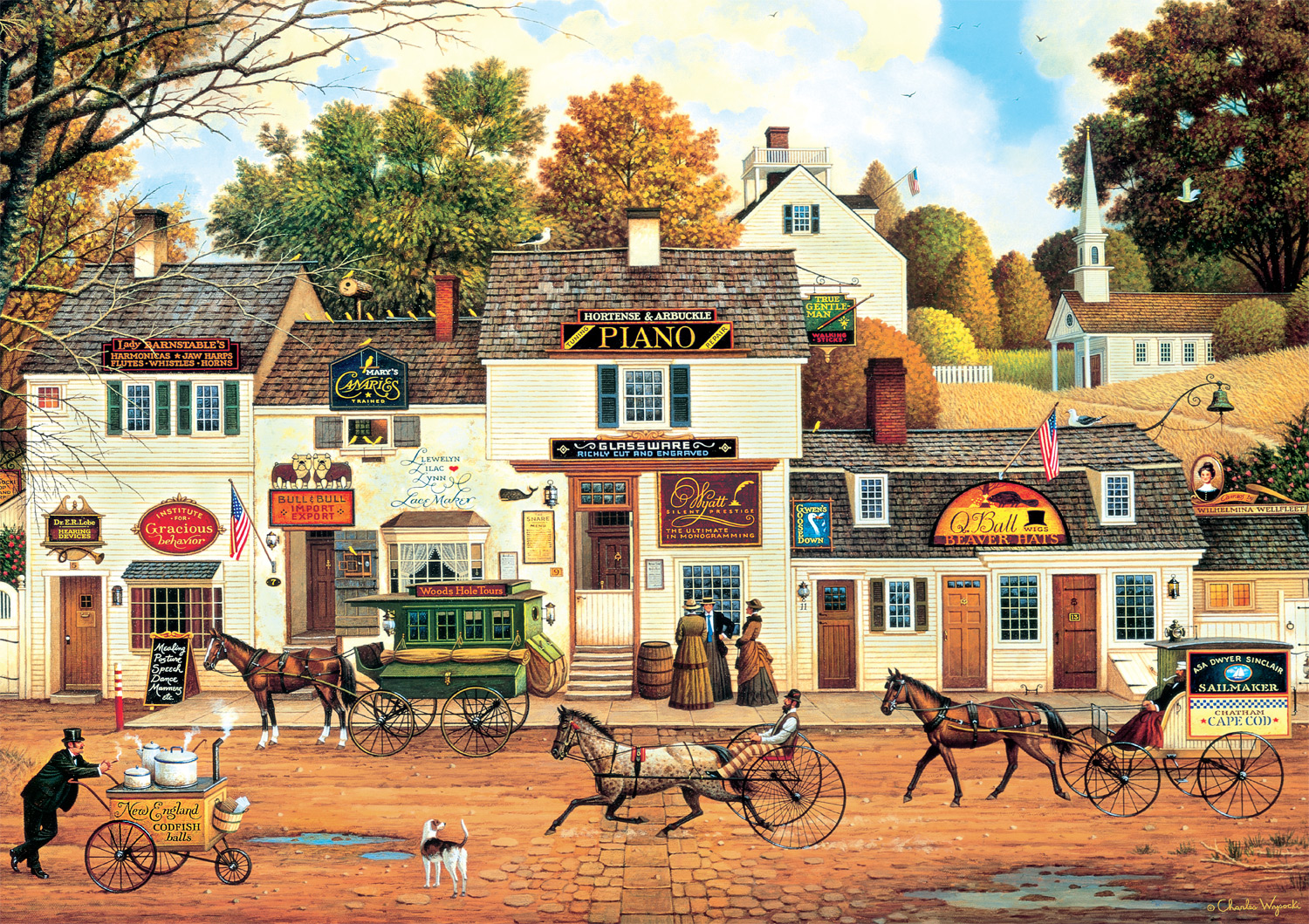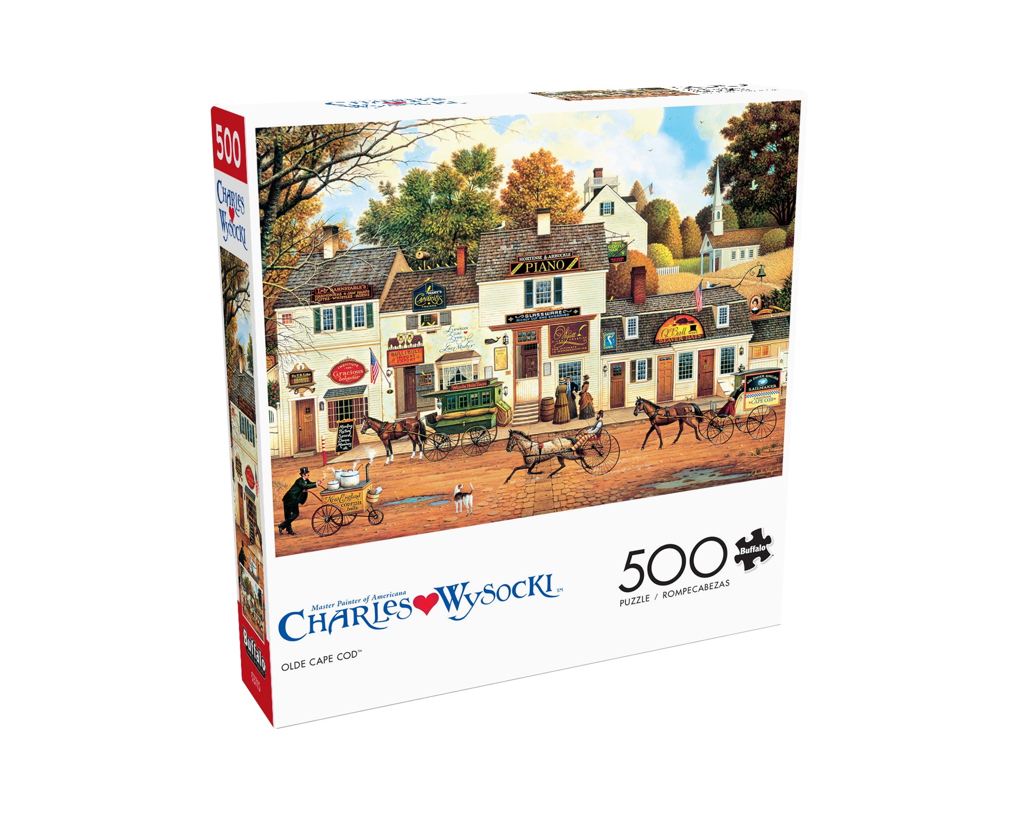 Olde Cape Cod is a 500-piece jigsaw puzzle by Buffalo Games featuring the artwork of famed master painter Charles Wysocki. Pianos, glassware, beaver hats, and even codfish balls. What more could you ask for in this classic americana depiction of New England life. Horse-drawn buggies litter the streets and birds fly overhead as the foliage changes to autumn colors. This quaint town is full of bustling shops. For more than 40 years, Charles Wysocki enjoyed his love affair with life and Americana, and through his imaginative and colorful artwork, touched the hearts of millions worldwide. Chuck felt a special kinship with puzzlers who share in the creative process by building his paintings one piece at a time. A bonus puzzle poster is also included so that you have a handy reference of what the completed puzzle should look like while you put yours together.
