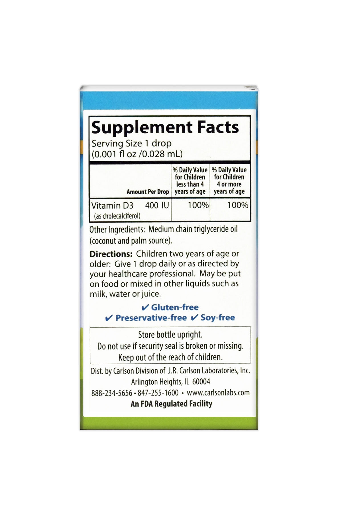 Carlson Labs – Kid’s Super Daily D3 Carlson 400 IU – .35 oz. (10.3 mL)Carlson Labs Kid’s Super Daily D3 Carlson 400 IU provides concentrated liquid vitamin D3 with added vitamin E in a single drop. Children can receive their daily dose of vitamin D3 by simply adding a drop to their food or drink. Carlson Kid’s Super Daily D3 provides a full 400 IU dose of vitamin D3 Teeth and Bone Health Healthy Immune Function. Maintains Calcium Balance Maintenance of blood calcium levels within a narrow range is vital for normal functioning of the nervous system, as well as for bone growth, and maintenance of bone density.