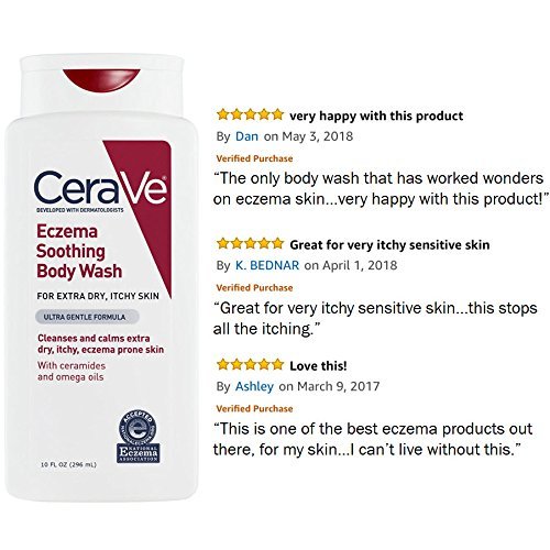 Developed with dermatologists, CeraVe Eczema Soothing Body Wash, an ultra-gentle formula, cleanses and calms extra dry, itchy skin. The formula contains hyaluronic acid to attract needed moisture to skin’s surface and three essential ceramides (1, 3, 6-II) to help repair the skin’s protective barrier.