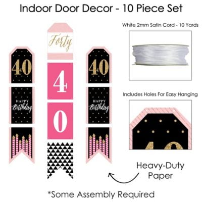 - Chic 40th Birthday – Pink, Black and Gold Indoor Door Decor INCLUDES: 10 heavy-duty paper pieces to create 3 vertical banners and 10 yards white 2mm satin cord. Easy assembly required.