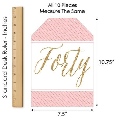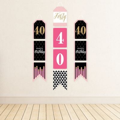 - PREMIUM PARTY SUPPLIES: Chic 40th Birthday – Pink, Black and Gold hanging vertical door banner decoration pieces are professionally printed one-sided on heavy-duty cardstock paper. Each banner piece is individually inspected and carefully packaged by hand. 40th birthday wall decoration kit requires some easy assembly. Follow the number sequence on the back of each banner piece and simply string the included cording through the pre-cut holes.