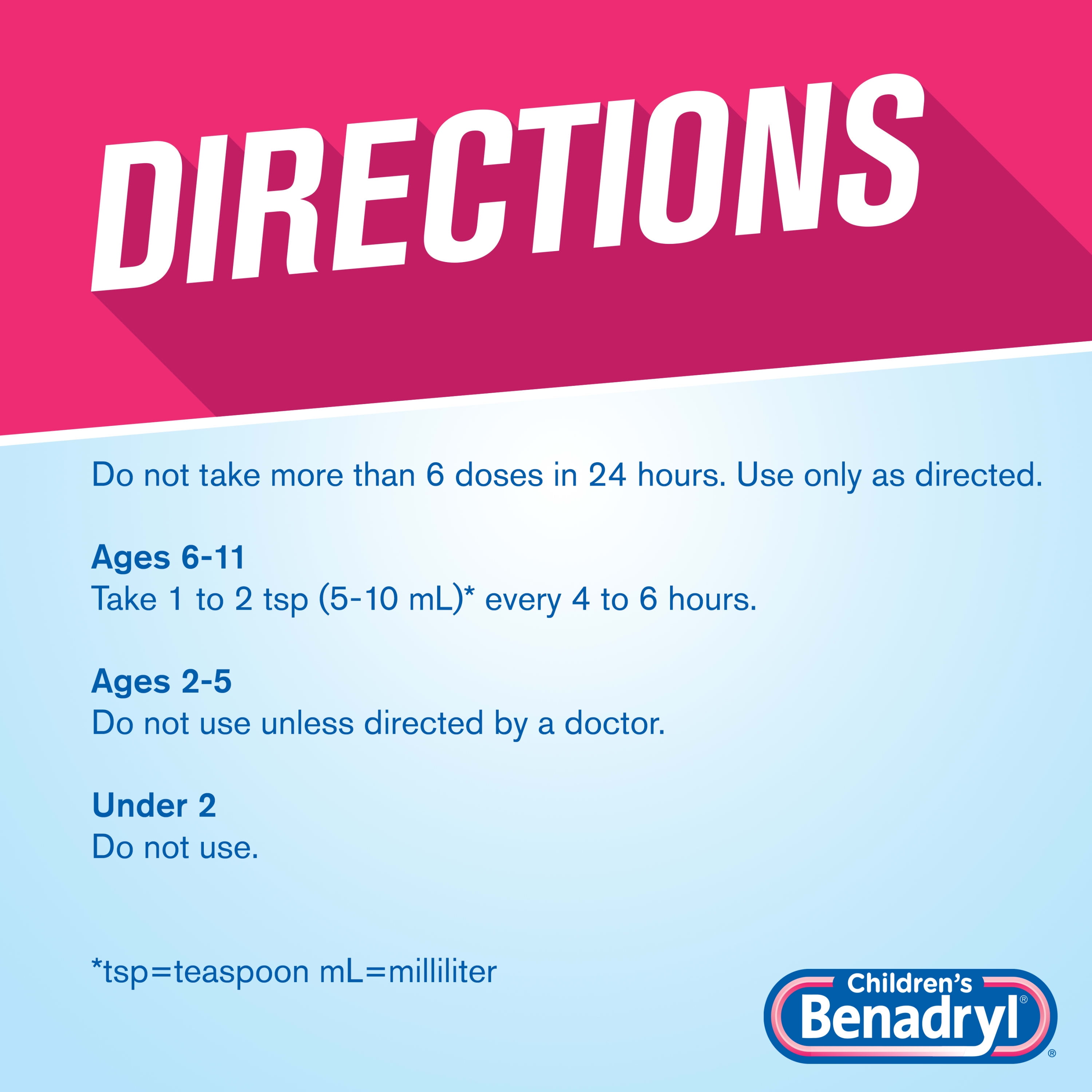 - Contains 12.5 mg diphenhydramine HCl antihistamine per dose to relieve your kid’s allergy symptoms
