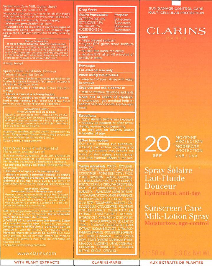 Clarins Sunscreen Care Milk-Lotion Spray UVB/UVA SPF 20, 5.3 OzClarins Sunscreen Care Milk-Lotion Spray UVB/UVA SPF 20, 5.3 Oz * moisturizes, age control * sun damage control care * multi cellular protection * Moyenne Protection * moderate protections SPF 20 UVB/UBA * with plant extracts * new in retail box