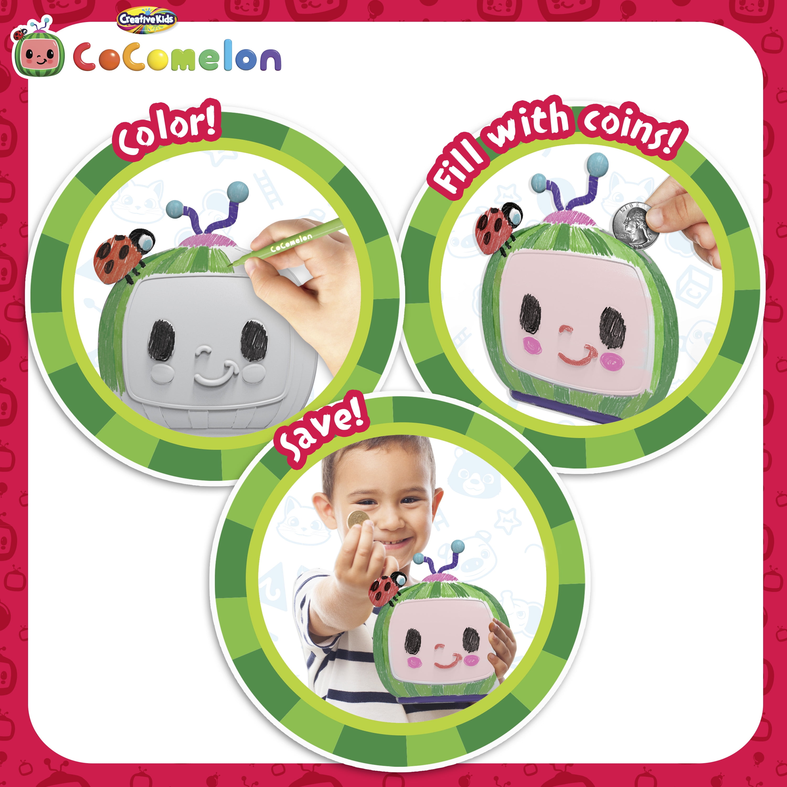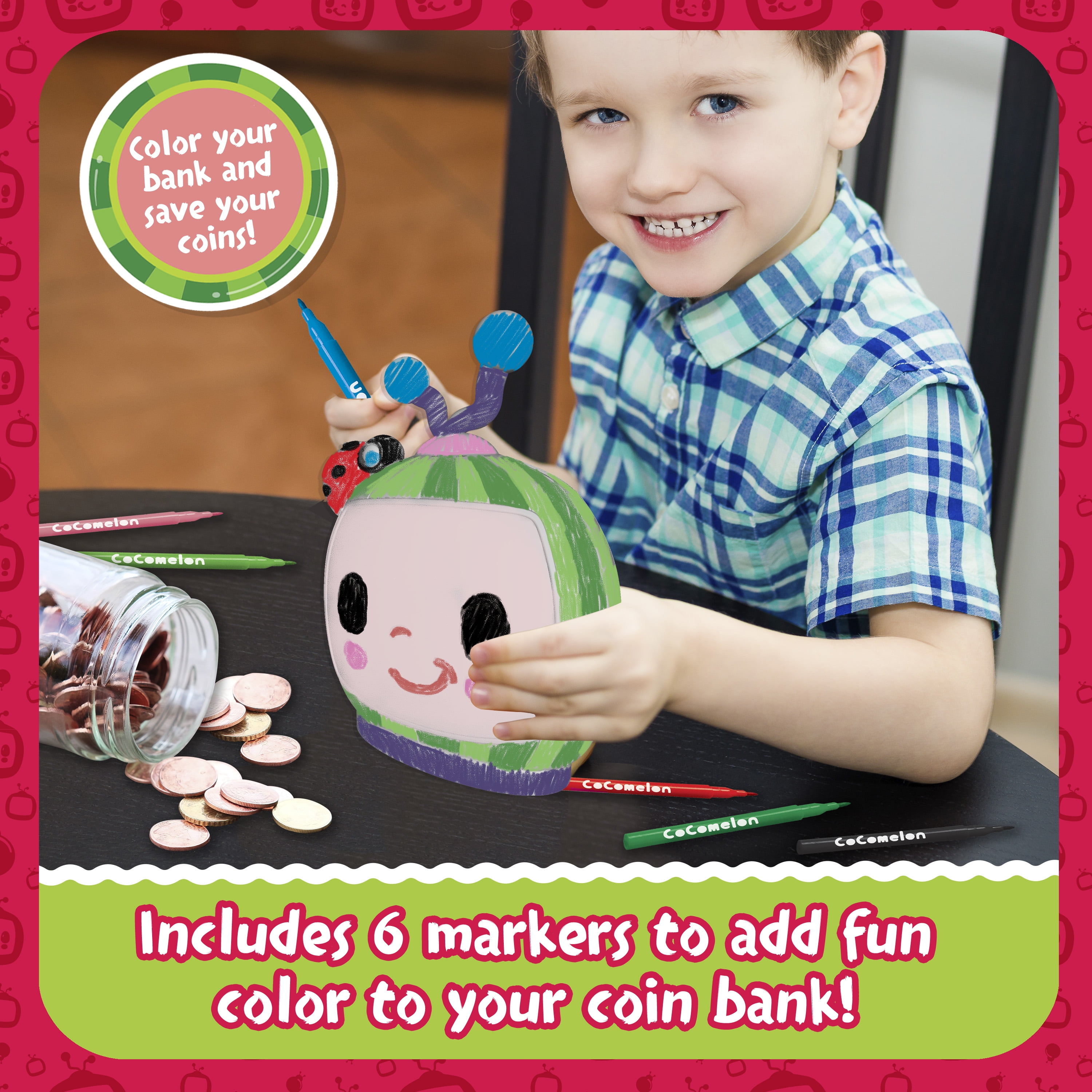 What You Get: 1 sturdy cocomelon coin bank to keep your money safe, 6 markers to add fun color to your bank