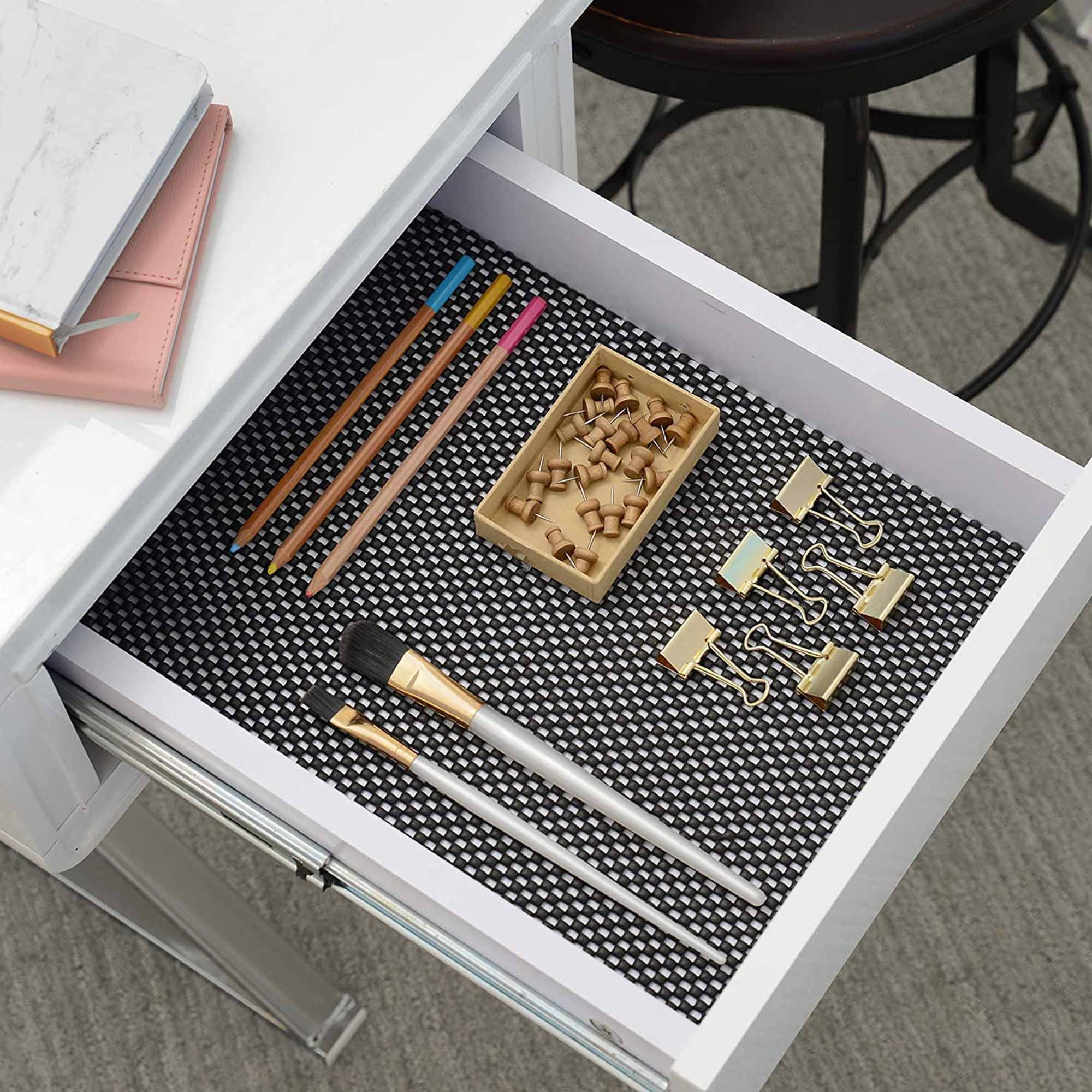 - Non-slip mats that trim to fit any drawer, box, or basket