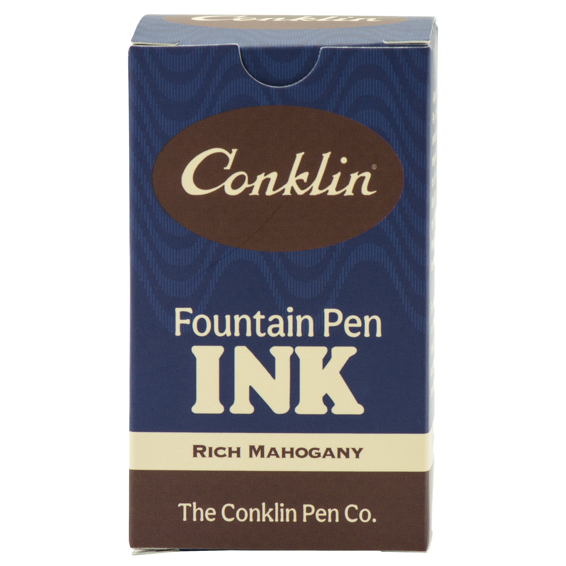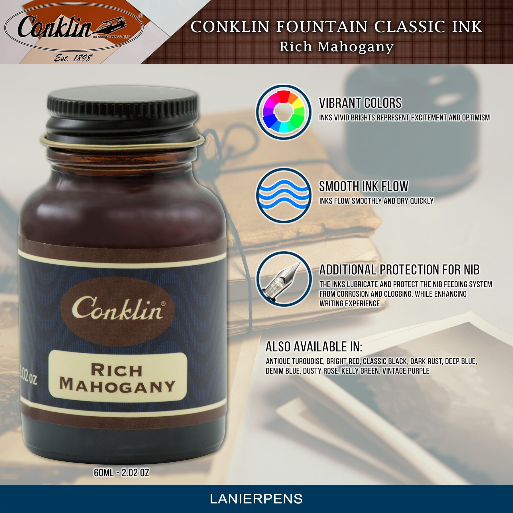Conklin Fountain Pen Ink in 60ml Glass Bottles (2.02 oz.) Conklin Ink is an eye-catching blend of vintage and modern characterized by vibrant colors, smooth ink flow, high saturation, exquisite colors and increased cap-off times. Conklin fountain pen inks are suitable for all fountain pens. Available in a variety of beautiful vibrant colors. Made in Europe, packaged in USA.