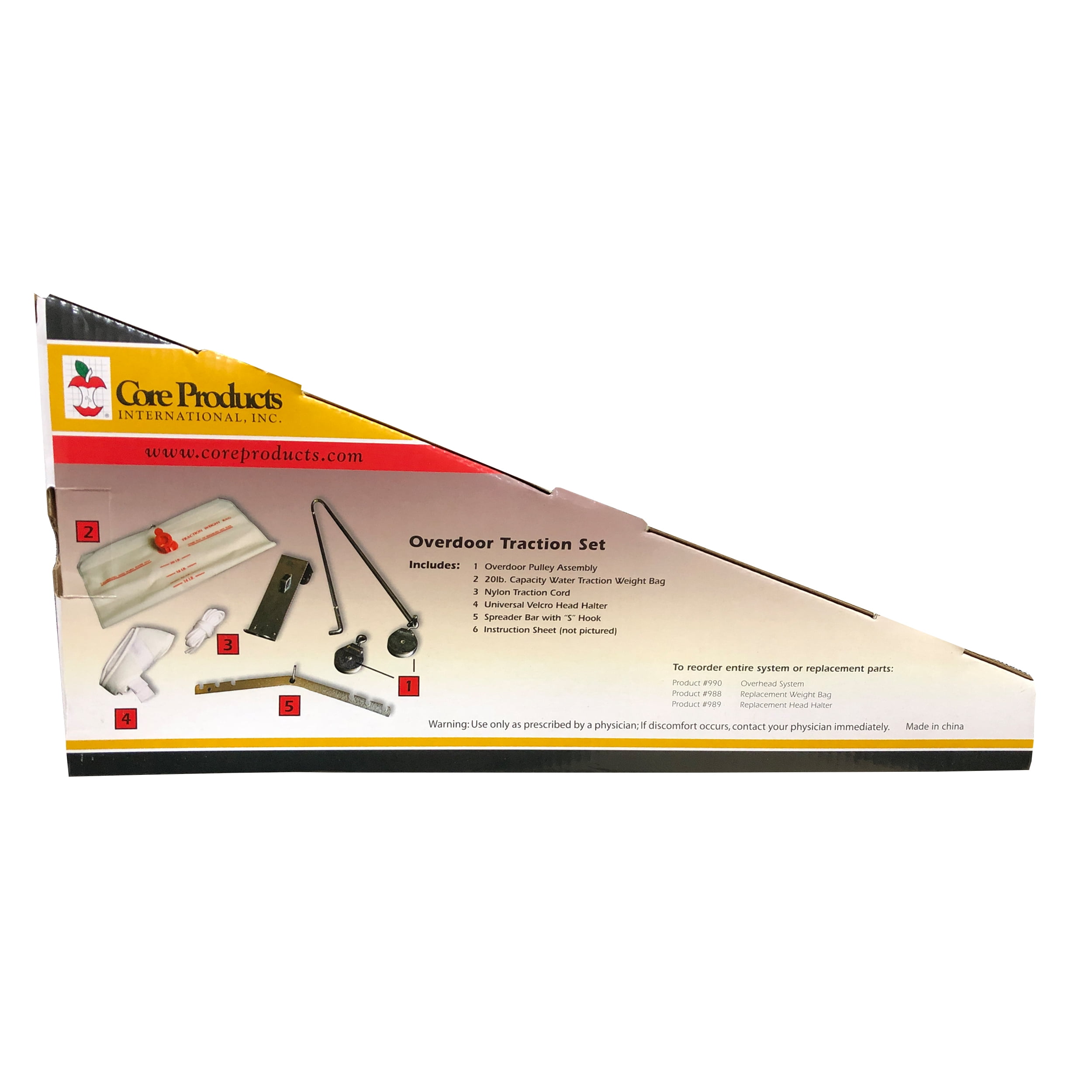 Package includes adjustable head harness, door mount, pulley assembly, and weight bag to customize pressure to patients needs. Made in the USA and contains no latex.