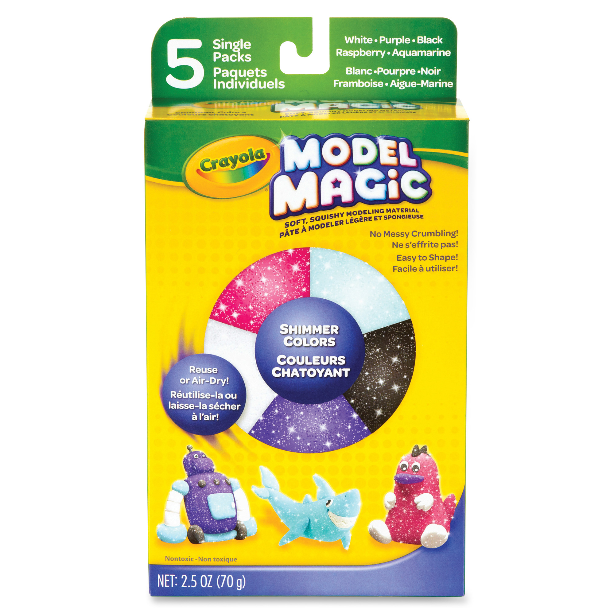 Model Magic is lightweight, spongy, and sticks to itself- not your hands! Shape it, mold it, and air-dry to save your projects or put it in a re-sealable container to play another day.This pack features White, Purple, Black, Raspberry, and Aquamarine shimmer colors.