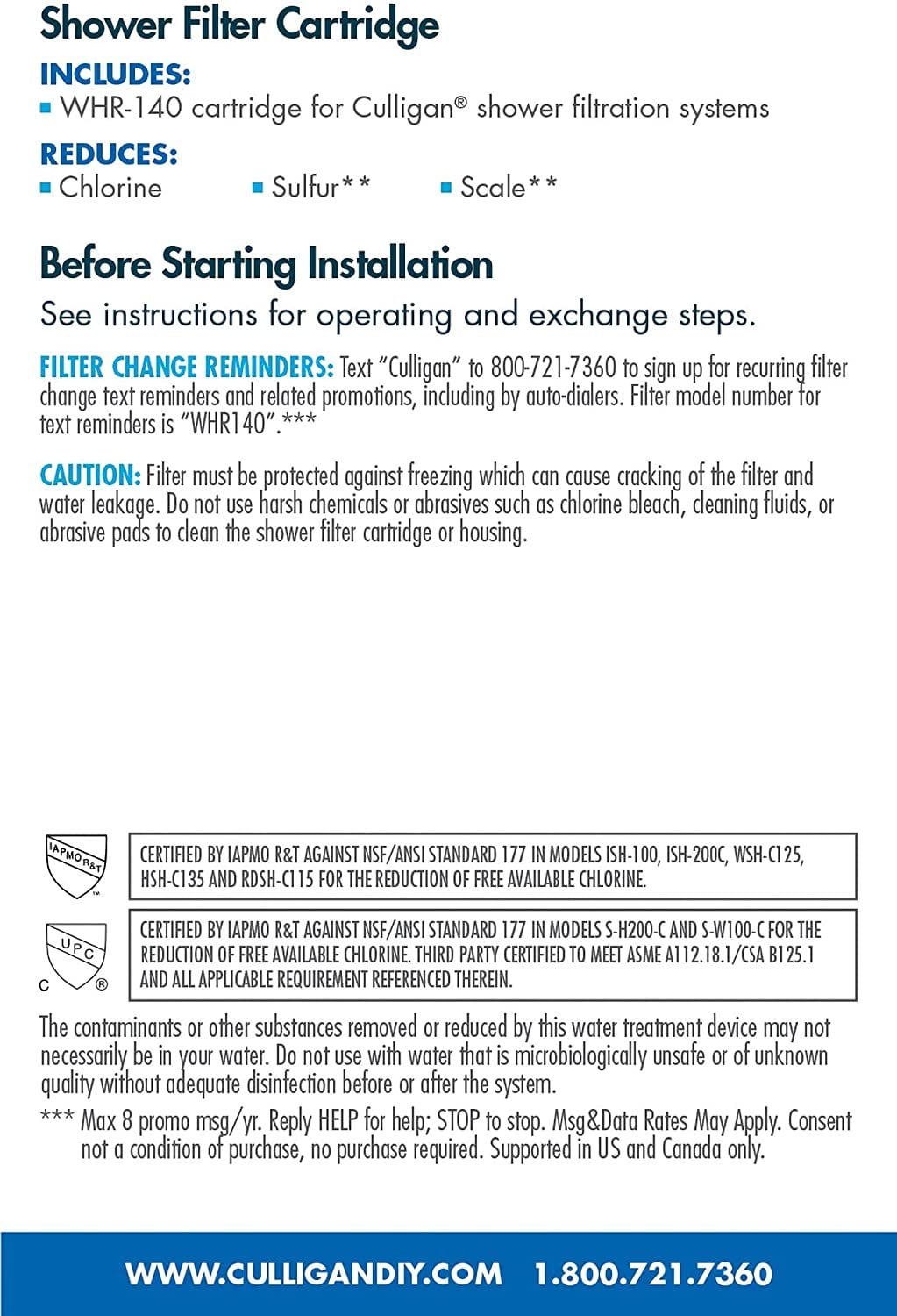 The Culligan WHR-140 Replacement Filter cartridge will reduce sulfur odor, chlorine, and scale For softer, cleaner skin, and hair. The filter is easy to install with no tools required, and each filter cartridge lasts 10, 000 gallons, or 6 months. This filter cartridge works with all Mulligan filtered shower heads, WSH-C125, WSH-BN125, RDSH-C115, HSH-C135, HSH-BN135, ISH-100, ISH-200c, ISH-300, S-H200-C, S-H200-BN, S-W100-c, S-W100-BN.