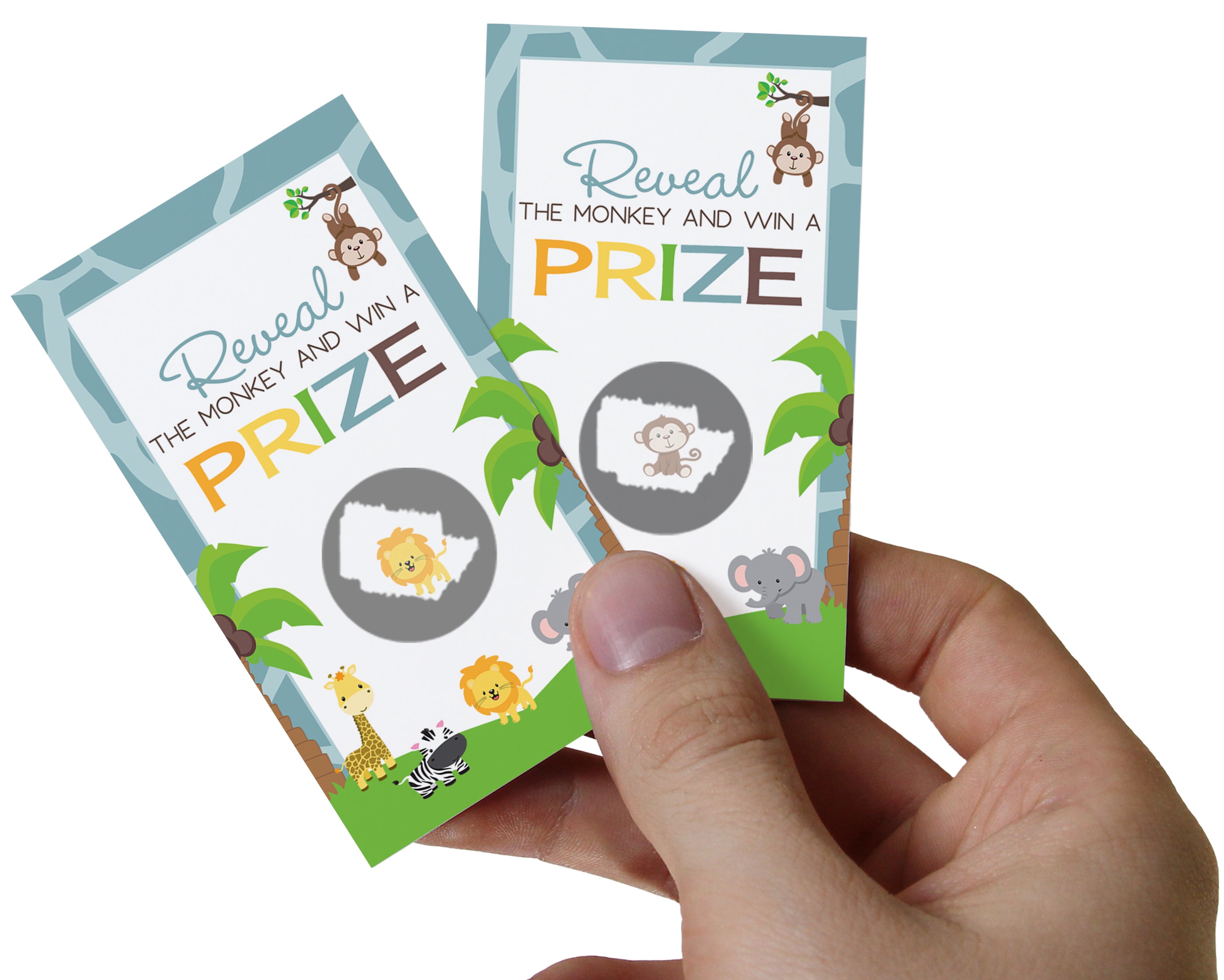 - Cute Jungle Scratch Off Game: PACK OF 28 Total Cards – 25 "Losing" + 3 "Winning" Cards. Bonus – Winners bagged separate from losing cards – Quickly know how many prizes you want to have on hand for wild adventure baby shower or party theme.