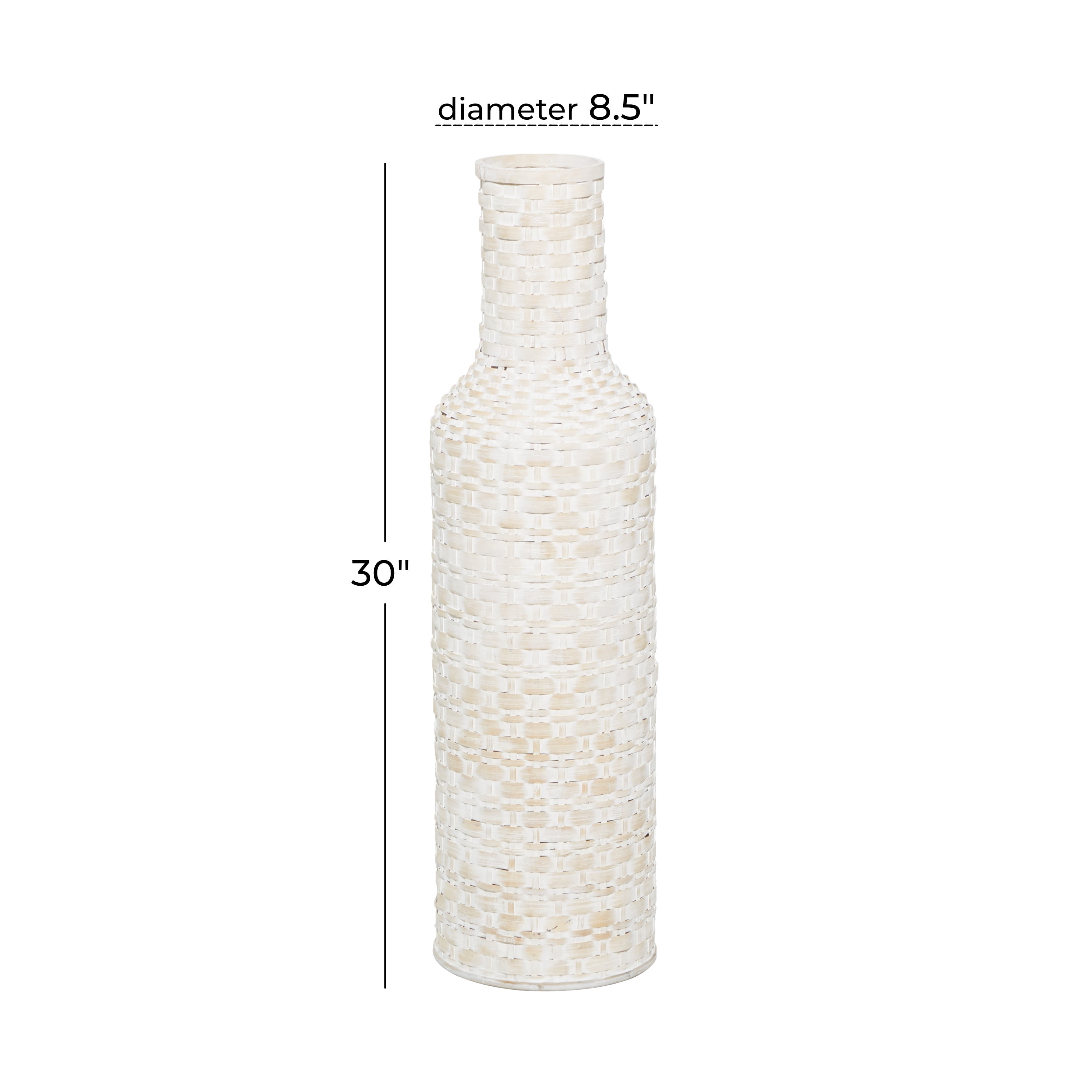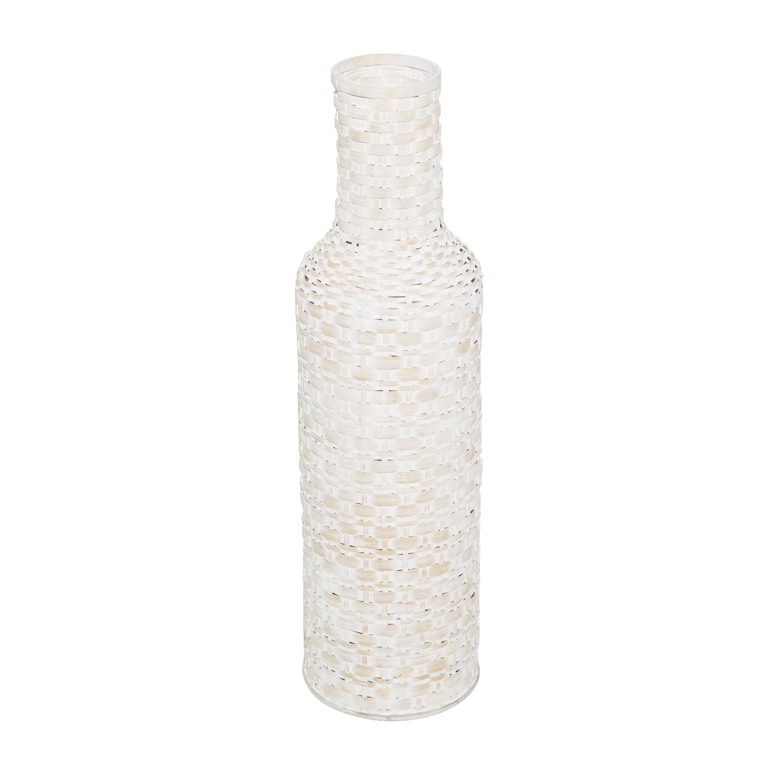 Appreciate their design best against solid-colored backgrounds in contemporary settings. They make great unique decor on mantle, console table or in any living space. This item ships in 1 carton. Suitable for indoor use only. Bohemian style. Tapered neck cylinder vases with 4" wide rim opening. DecMode 9"W, 30"H Boho Style Bamboo Vase, White, 1 – Piece