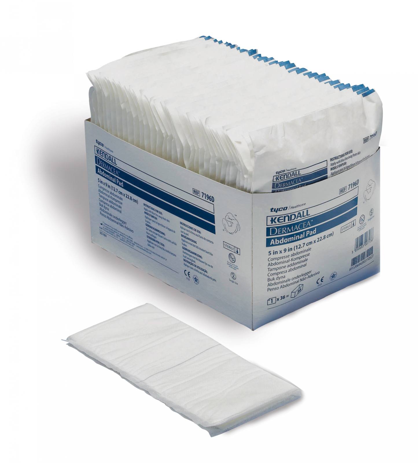 Curity Abdominal Pads are designed for maximum absorbency and comfort. All four edges are sealed to prevent lint residue and leaking. Pads measure 5 X 9 Inch, rectangle shape with non-woven fluff material. Manufacturer# 7196D.