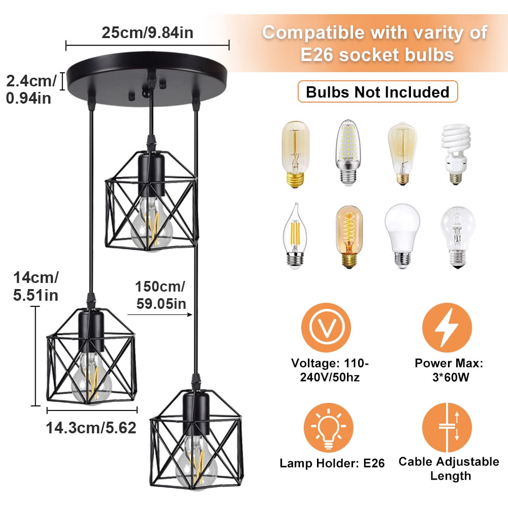 - 3*E26 Socket: E26 US standard lamp sockets, compatible with a variety of bulbs(Max:3*60W), such as incandescent, LED, CFL and halogen bulbs (Bulbs Not Included). And it also compatible with dimmer, you can use a dimmable bulb, adjust and enjoy the soft illumination of retro look, creating the atmosphere you want.(dimmer switch buy separately )