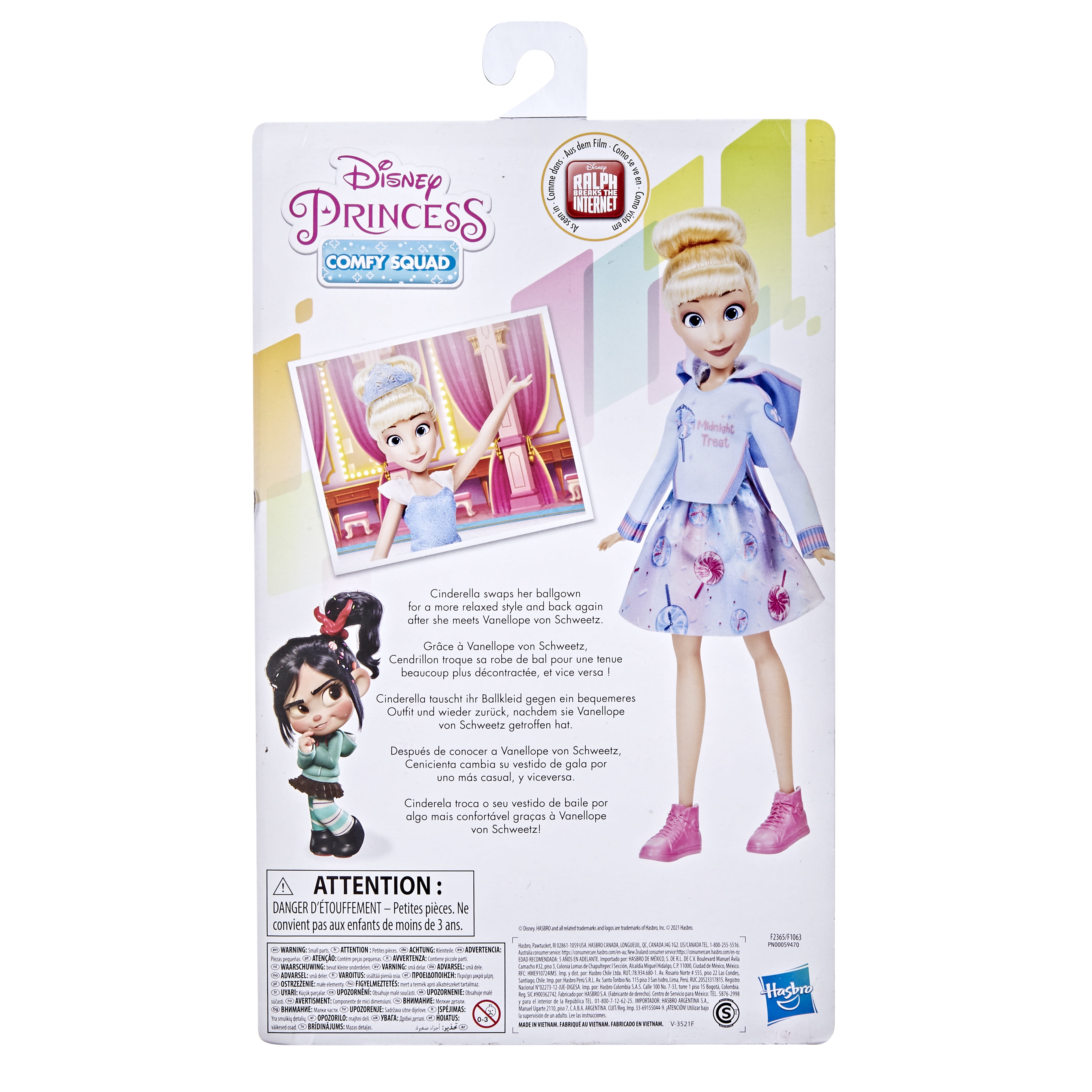 Disney Princess Comfy Squad Comfy to Classic Cinderella Fashion Doll with Extra Outfit and Shoes, Disney Princess Toy for Girls 5 Years and Up Disney Princess Cinderella is ready for a fancy Royal Ball or a casual evening at home with her friends with this Comfy to Classic Doll. Inspiredby the movie Ralph Breaks the Internet, this fashion doll toy includes 2 different outfits. Her elegant ballgown sparkles with glitter and features a peplum and bodice, while her 2-piece casual outfit is made up of a skirt and hoodie jacket with a fun graphic that says, xe2x80x9cMidnight Treat.xe2x80x9d Therexe2x80x99s also 2 pairs of shoes, flats and sneakers, and a tiara for more fashion fun with this beloved Disney Princess. Comfy to Classic Cinderella makes a great gift for kids 5 years old and up and is a great addition to any Disney Princess collection. Look for Comfy to Classic Ariel, too, and other Disney Princess dolls featuring characters like Aurora, Belle, Jasmine, Moana, Rapunzel, and Tiana. (Other dolls sold separately. Subject to availability.) Copyright DisneyHasbro and all related terms are trademarks of Hasbro. Includes doll, 2 outfits, 2 pairs of shoes, and tiara. Ages 5 and up.WARNING: CHOKING HAZARD – Small parts. Not for children under 3 years. xc2xa9 2021 Hasbro. All Rights Reserved. xc2xa9Disney