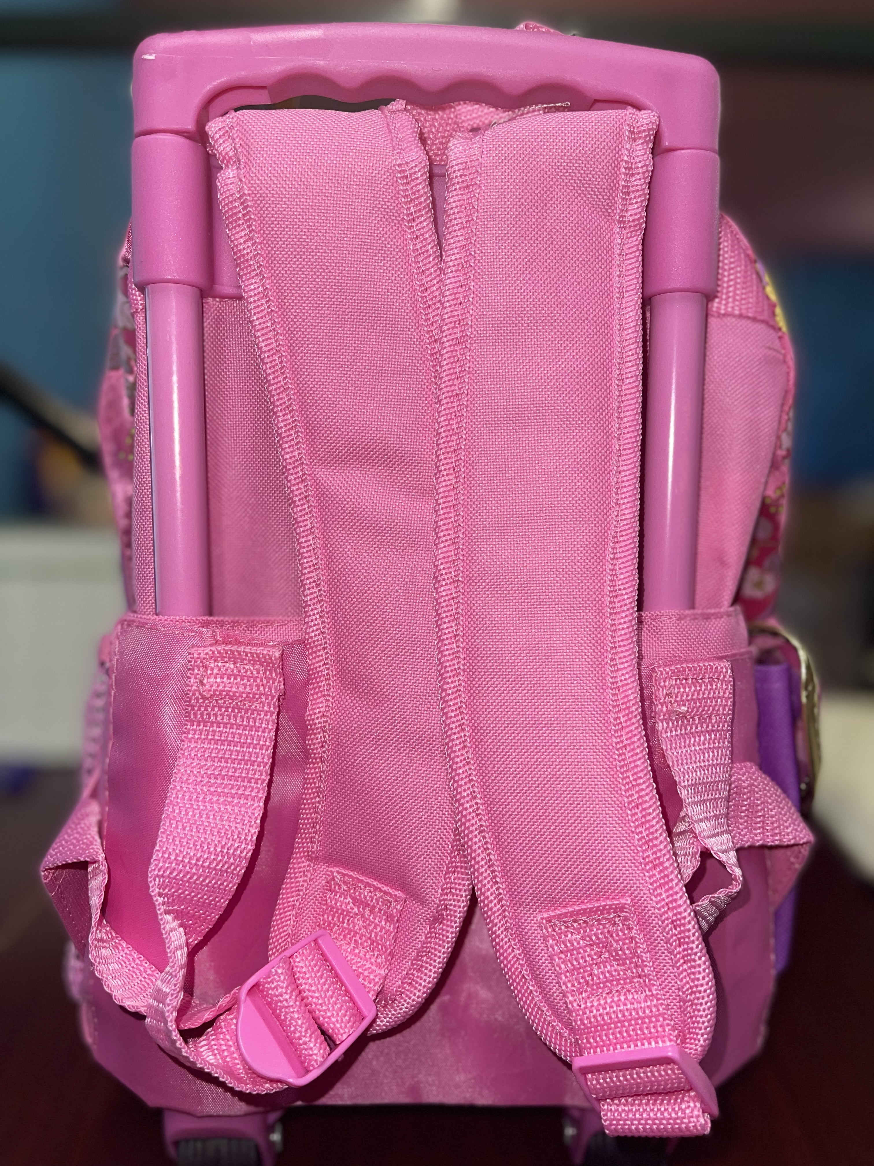 This amazing Disney Princess backpack is made with all the details that your little one will definitely love. The durable backpack is made of durable polyester with gold accents, and shiny pink satin gives that royalty feel. Comes with adjustable straps that are also lightly padded for extra comfort. Another great feature is the extendible handle that allows your child to roll the backpack on the bottom 2 wheels. Has one large main compartment with zipper closure, big enough to fit notebooks, binders, or books and a large front pocket, suitable for smaller belongings to be organized. Also features top handle for hanging or easy handling. Another great addition is the 2 side pockets, one elastic mesh that can hold bottles, and a Velcro flap down pocket that allow smaller items to be organized. Makes a great back to school gift for boys and girls of ages 3+. Unisex. Made of durable polyester blend, and the handle made of plastic and metal, designed to last.