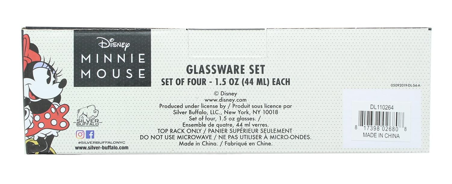 Show off your love of classic Disney with this quality mini glass set! Each colorful 1.5 ounce mini glass features a unique image of Minnie Mouse. Set includes four (4) mini glasses. Durable glass construction. Produced by Silver Buffalo, a trendsetting housewares and home decor company based in the heart of New York City.