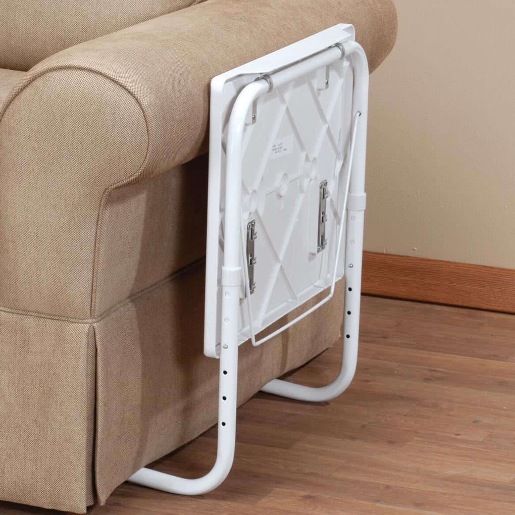 Adjustable tray table slides in close while you relax on your sofa or bed. Choose from 6 heights and 3 angles. Wipe-clean tray table is ideal for eating, writing, crafting, computing and more. Folds for convenient storage. Easy assembly; no tools required. 26" H; tray measures 20 1/4" L x 15 1/4" W. Bottom setting is approximately 19" from floor, middle setting is 23" from floor, and top setting is 27 1/2" from floor. Plastic/steel.