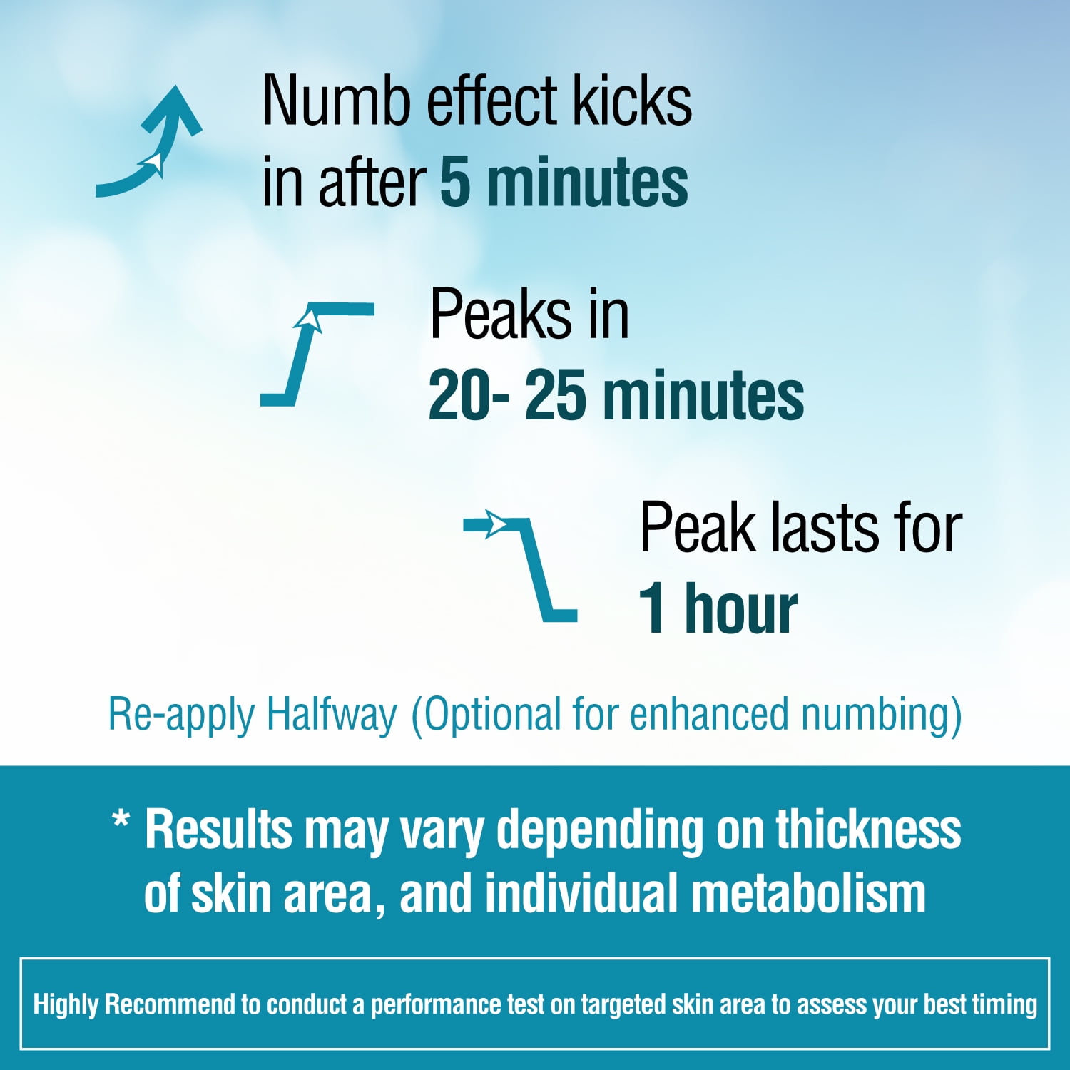- FAST-ACTING & LONG-LASTING – This topical lidocaine cream maximum strength numbs in 2-3 minutes; peaks after 20-25 minutes; lasts for 1 hour from its peak