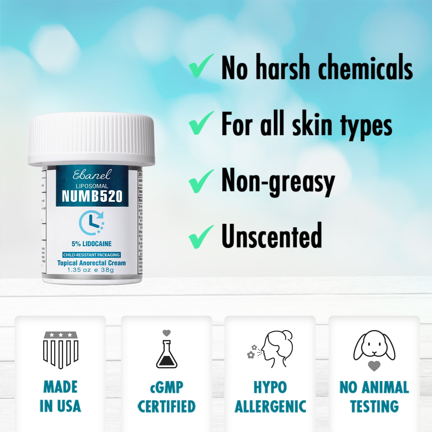 You don’t have to endure the pain. Ebanel Numb520 5% Lidocaine Numbing Cream fast relieves pain for your skin treatment and health care needs. This OTC (over-the-counter) lidocaine cream pain relief drug is specially formulated with maximum strength lidocaine and enhanced penetration with our signature Liposomal technology for the best results. Recommended use for minor cuts, minor scrapes, minor burns, insect bites, anorectal disorders. Safe and great for all skin types. Formulated and bottled in an FDA-registered facility in California, USA.