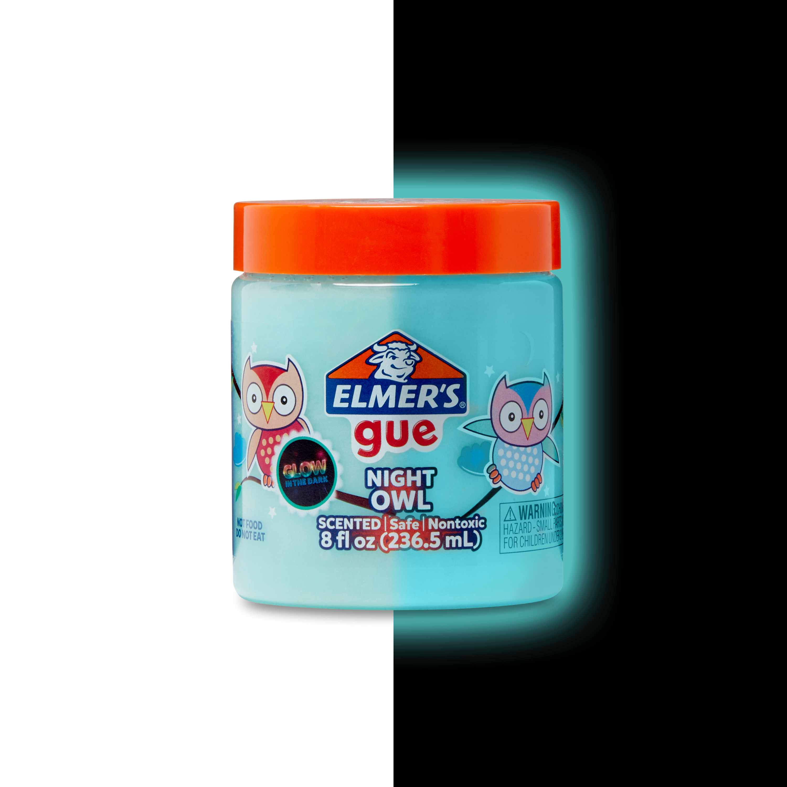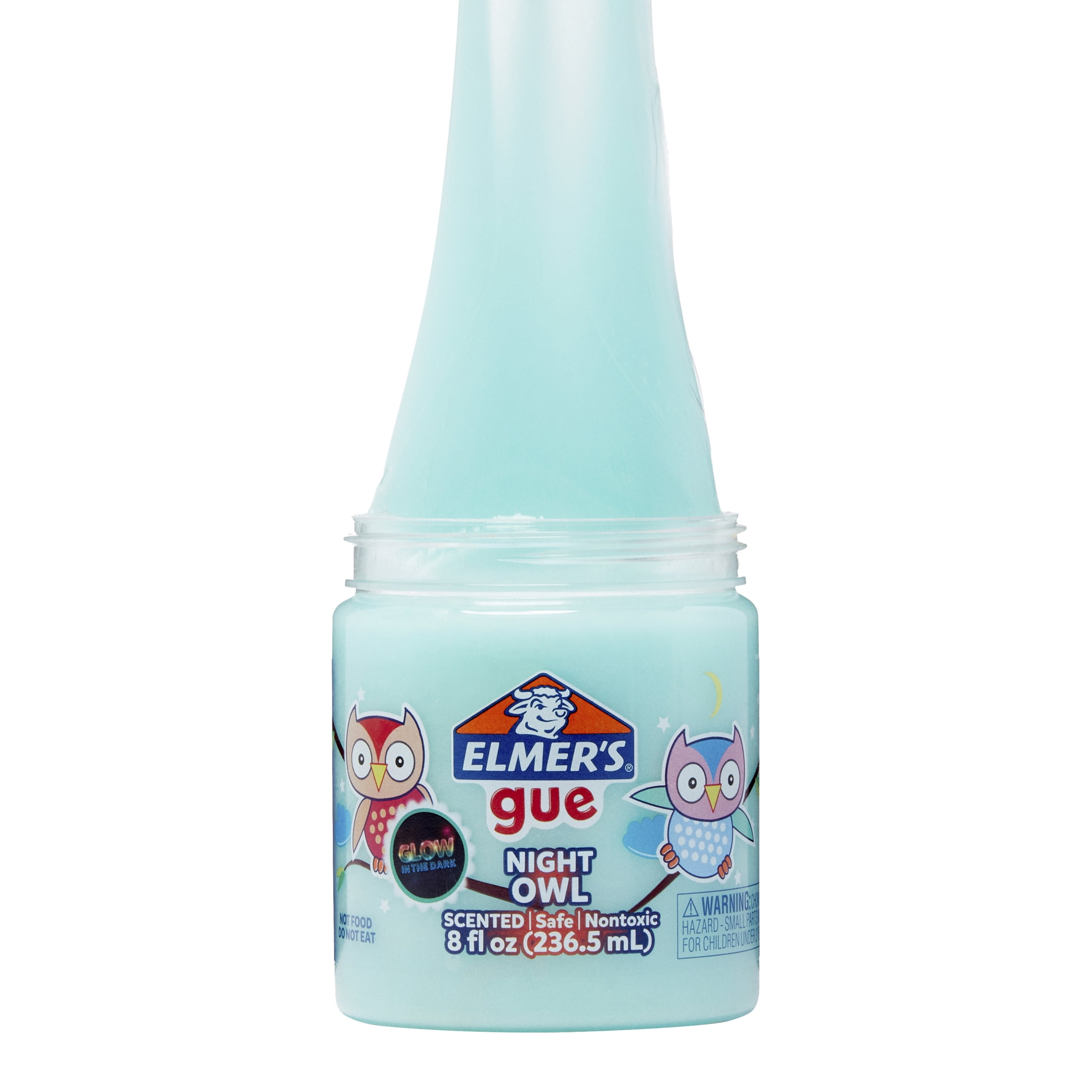 Try not to stay up too late playing with Elmerâs Gue Night Owl Premade Slime. Itâs a glow-in-the-dark slime that shines when the lights go out, making it hard to put down. Plus, its safe, nontoxic formula makes it great for kids. Stretch it, squish it, twist it explore all the fun ways to play with Elmerâs Gue for slime fun.