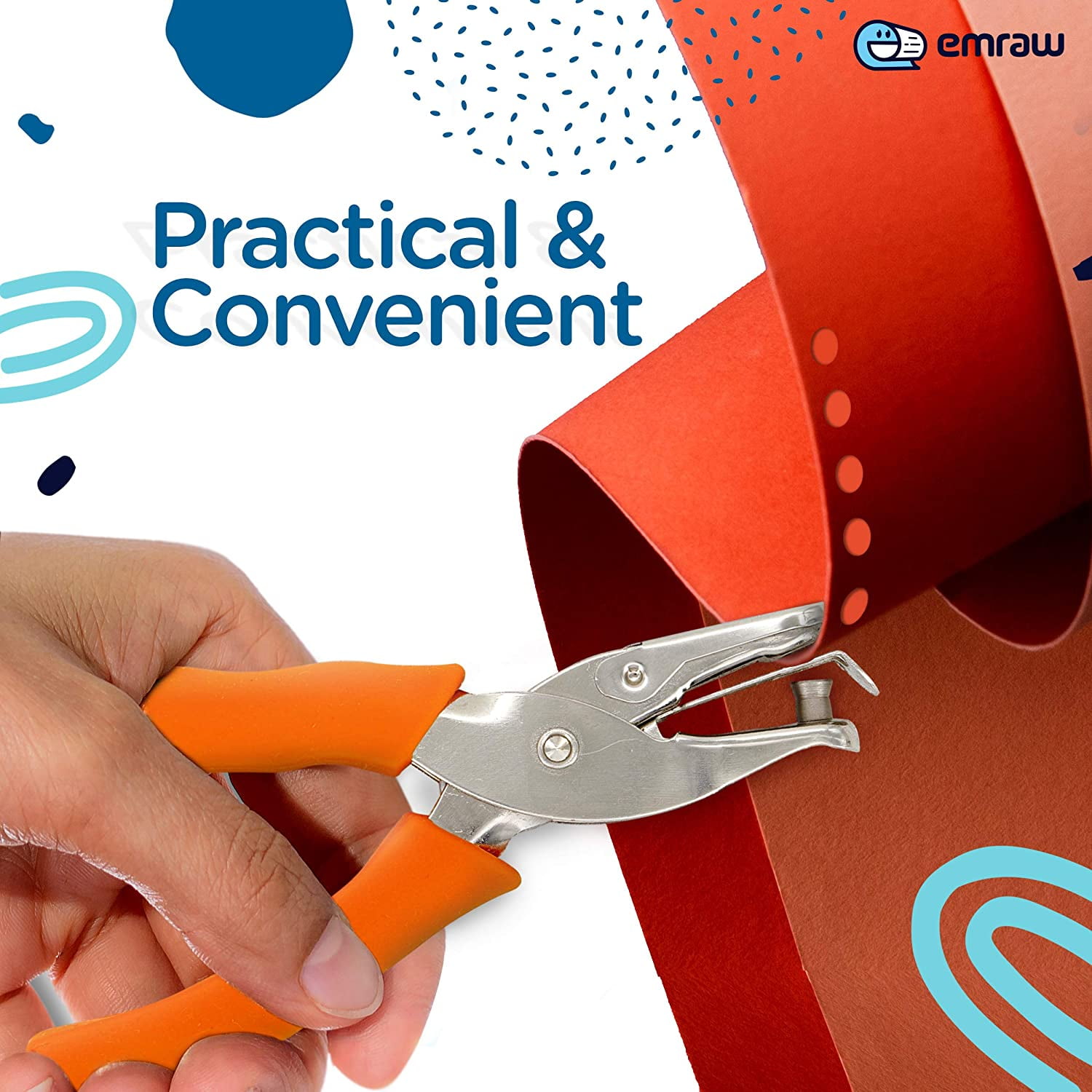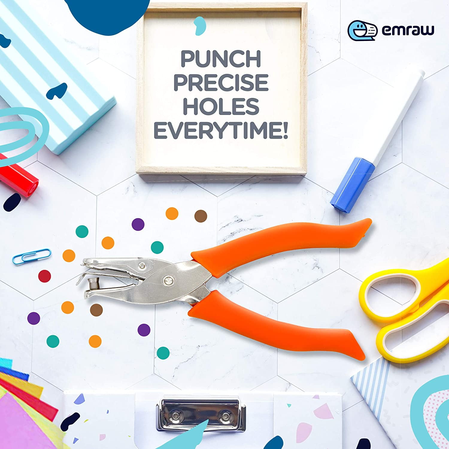 About Emraw Premium Single Hole Paper Punch Cushion Grip Premium Single Hole Paper Punch with Cushion Grip, Single hole punch features rubber grip for comfort. Traditional design is ideal for punching simple shapes in craft projects for both functional and decorative purposes, Premium Single Hole Paper Punch w/ Cushion Grip, Made of high quality metal, fine workmanship, strong texture, durable and good quality, feel comfortable and has a long service time, offers a comfortable grip feeling, necessary and good tool for school, home and office Lightweight and Practical: It comprises of a handy punch with a chip holder, design of waste clip holder adds convenience and saves cleanup time, This paper hole punch is lightweight and practical, a great office tool to use, and also can be used for craft making, scrap booking or ticket punching, Plastic bag handle, easy to take hold, do not worry about scratching, It has extended comfort handles for greater control, Great for crafts’ project, metal and with plastic soft grip handle cover, Perfect for scrap booking, programs and greeting cards, etc Convenient and Easy to Use: The hole punch serves the normal purposes at school, home, or work. 6 pack, the portable tool is made of metal, durable and not easy to rust; Necessary and good tool for school, home and office, It is easy-to-use and convenient for general purposes. At a time, the hole punch can punch up to around ten sheets, Great punching for invitations, greeting cards and scrapbook etc, Designed with clippings container for gathering the messy hole scraps Features Pack of 6, Features rubber grip for comfort The punch produces 1/4" holes that accommodate most binding devices Built-in Waste clip holder adds convenience and saves clean-up time Punches up to 5 Sheets Colors May Vary