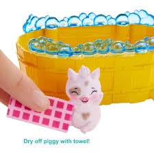 - Help Petya Pig doll (6-inch) bathe her piggy pals with accessories like a brush, rubber ducky, soap bottles, and more!
