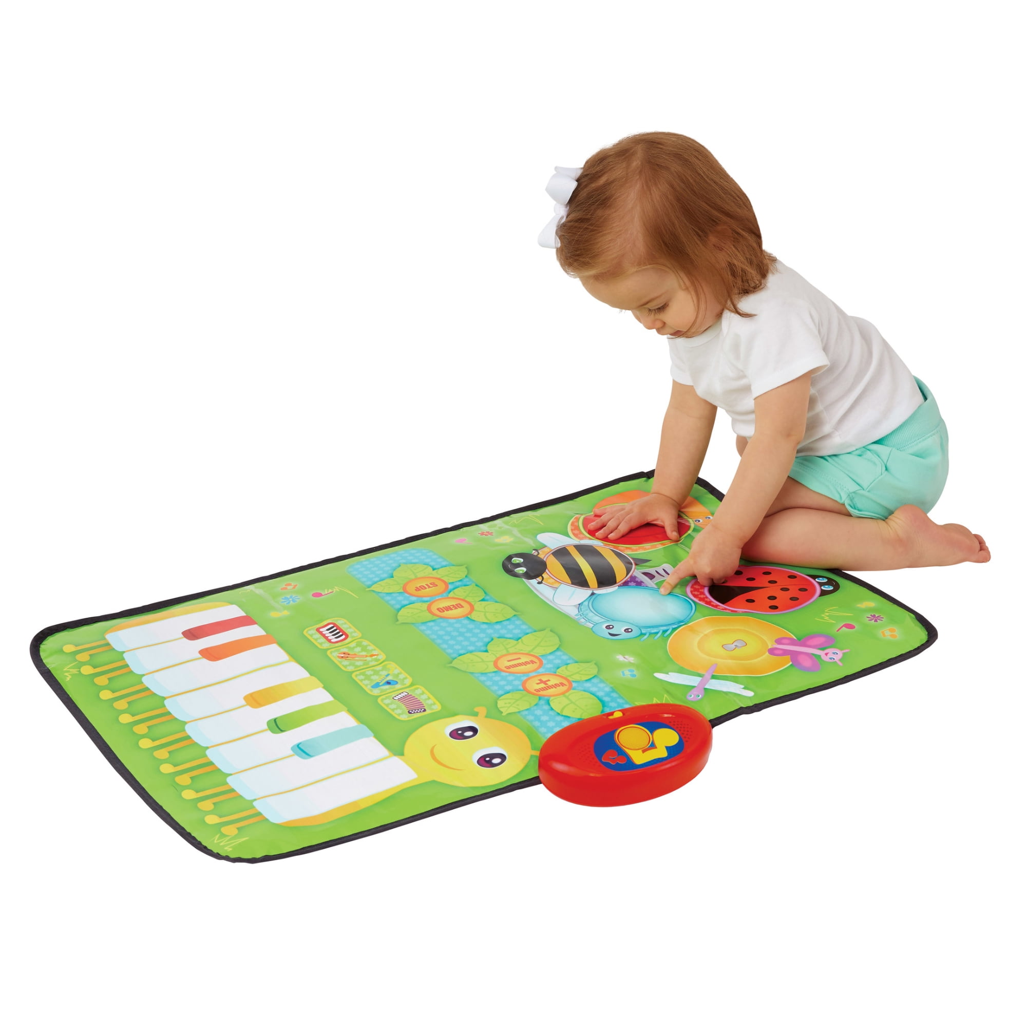 The musical floor play mat is a fun and engaging way to play for children. Designed for ages 18 months and older. This musical floor pad plays drum and keyboard sounds. The caterpillar keyboard can play up to 4 instruments and features an on/off switch and volume control. Requires 2 "AA" batteries required (not included).