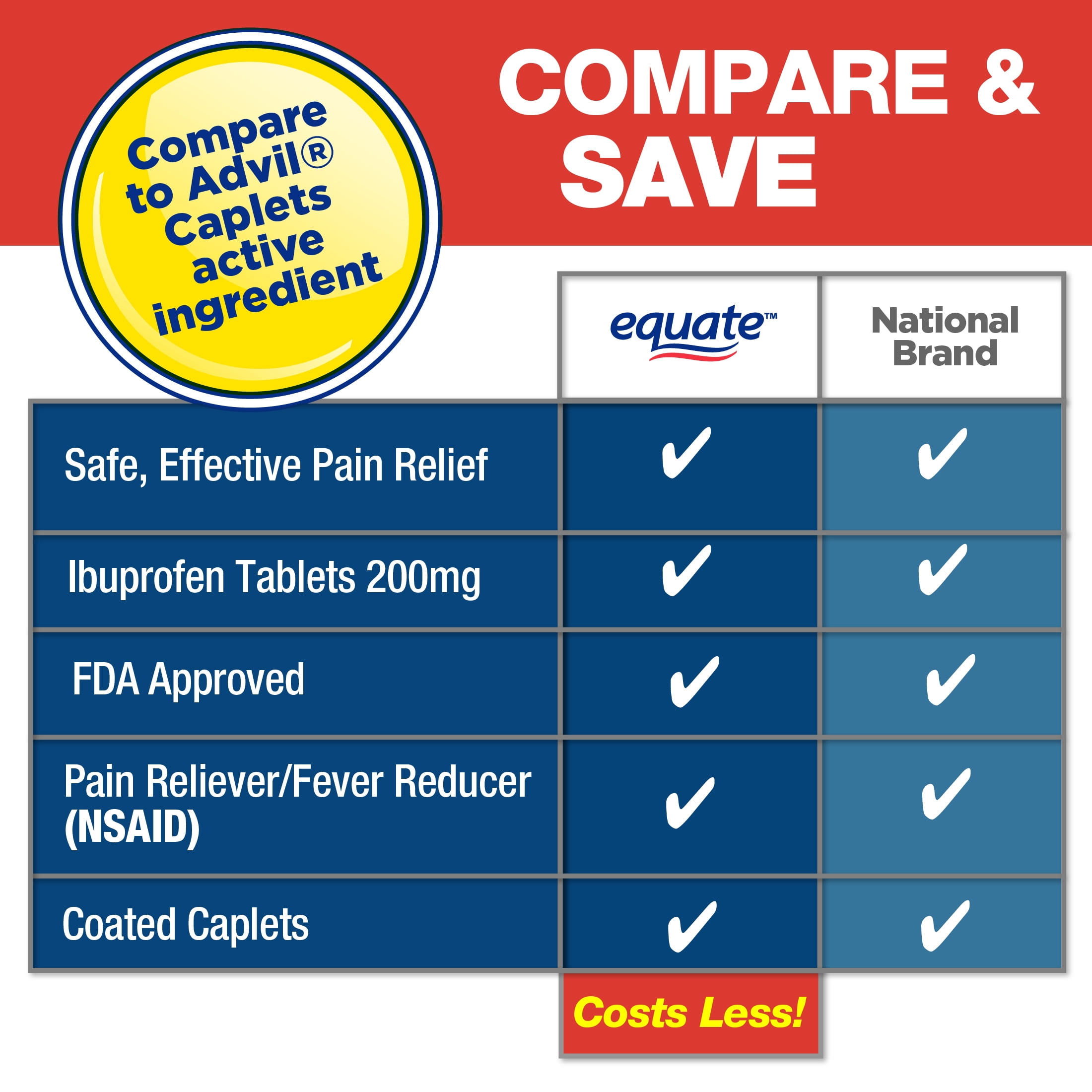 Compare to the active ingredient in Advil Ibuprofen Caplets. Don’t let aches and pains slow you down. Equate Ibuprofen Tablets 200 mg provide powerful pain relief you can trust. They help to temporarily relieve minor aches and pains due to headache, muscular aches, minor pain of arthritis, toothache, backache, the common cold and menstrual cramps. Ibuprofen is the number one doctor recommended OTC active ingredient for back pain (of U.S. physicians surveyed by an independent market research firm). For adults and children 12 years and over. Coated, capsule-shaped tablets.