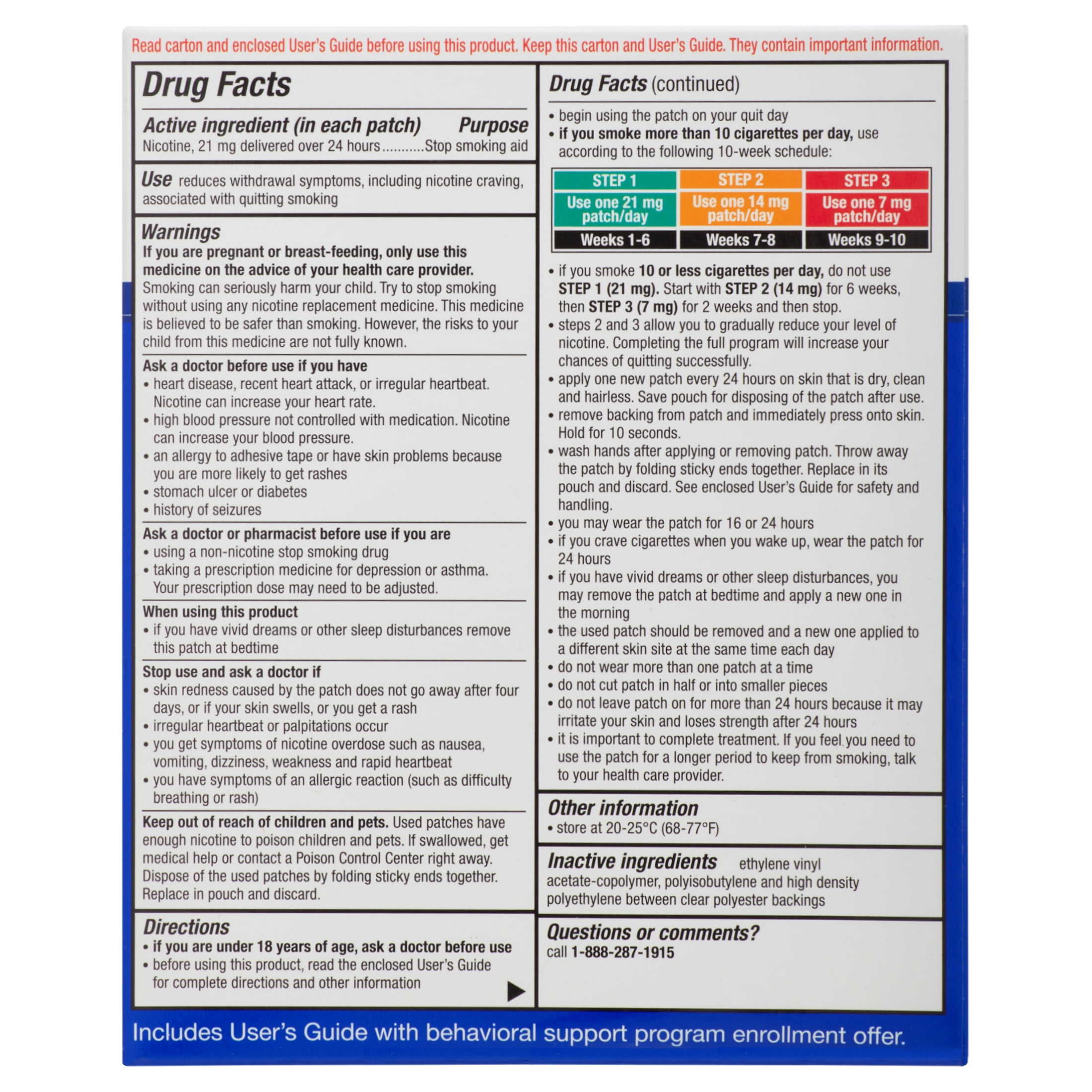 Equate Nicotine Transdermal System Step 1 Patches are the first step in our three-step system to help you quit smoking. Our patches are part of a 10-week quitting program that’s designed to help you successfully quit smoking. The active ingredient in each Step 1 patch is 21 milligrams of nicotine that, when used properly, can reduce withdrawal symptoms, including nicotine craving associated with quitting smoking. Begin using the patch on your quit day by applying one new patch on skin that is dry, clean, and hairless. Wear your patch for 16 to 24 hours and then reapply every 24 hours. Be sure to follow these instructions as they are listed in the support program packet that’s included in the enclosed user’s guide. These Step 1 stop smoking aids are recommended for individuals who smoke more than 10 cigarettes per day. If you smoke 10 or less cigarettes per day, start with Step 2. Completing the full program will increase your chances of quitting successfully. All you need to do is take the first step with Equate Nicotine Transdermal System Step 1 Patches.