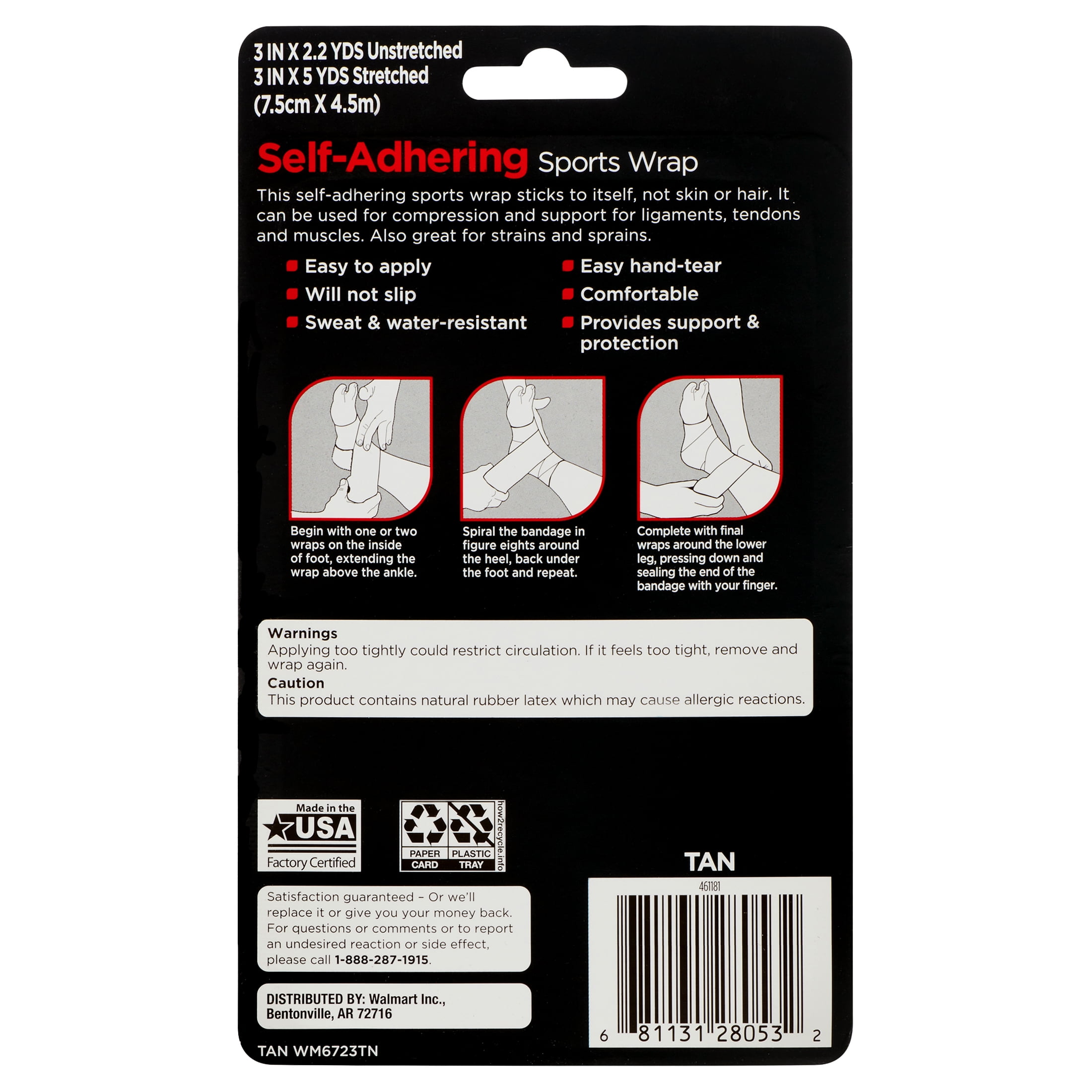 Forget messy clips and pins for tying bandages; Equate Self-Adhering Sports Wrap provides a strong and comfortable support while sticking to itself, not your skin or hair. It is great for strains and sprains can be used for compression and support for ligaments, tendons and muscles, and is also great for strains and sprains. It can be easily applied by tearing with hand, and is sweat- and water-resistant. Lightweight and effective, these wraps will give your injured limb the support it needs and help you get back to your favorite sports in no time.
