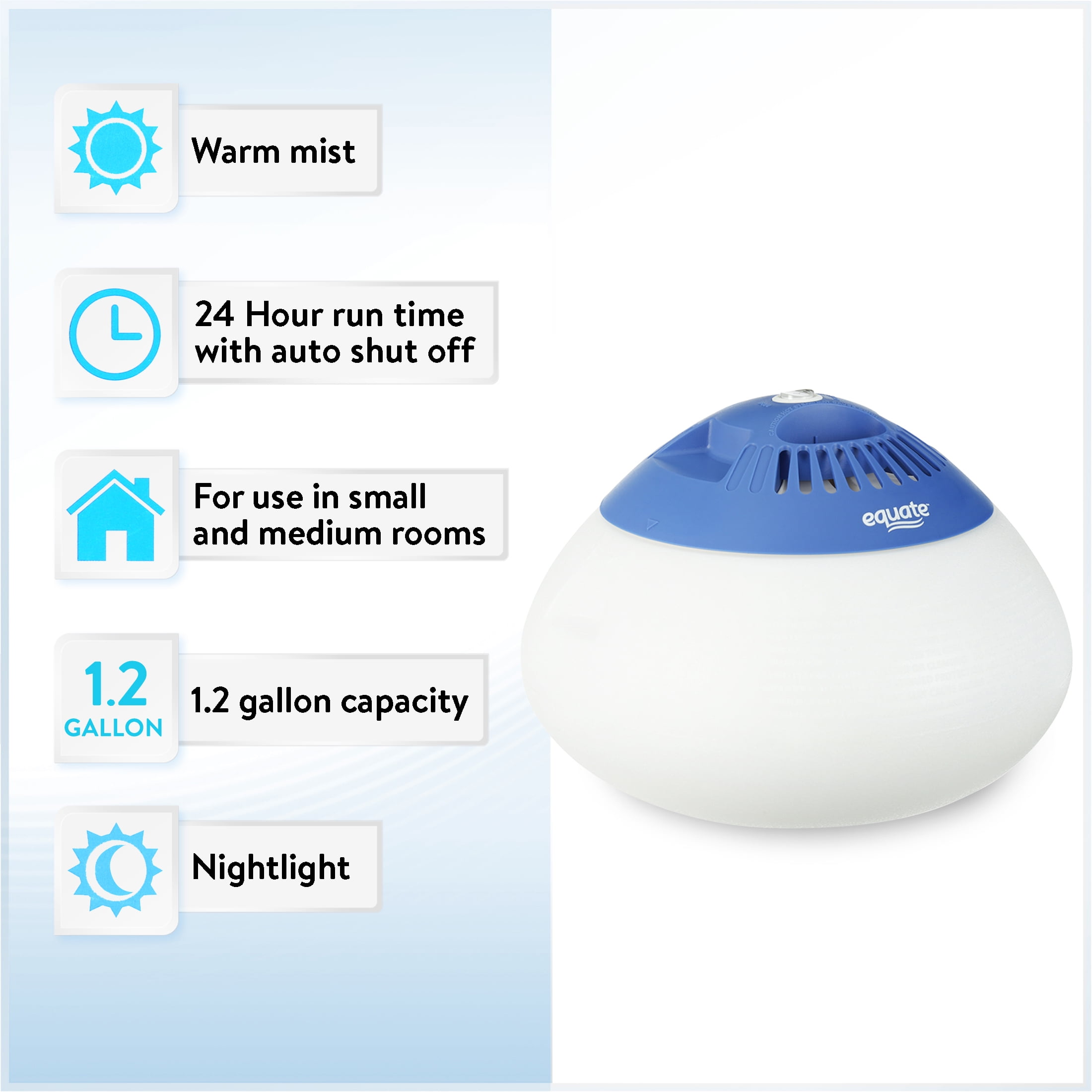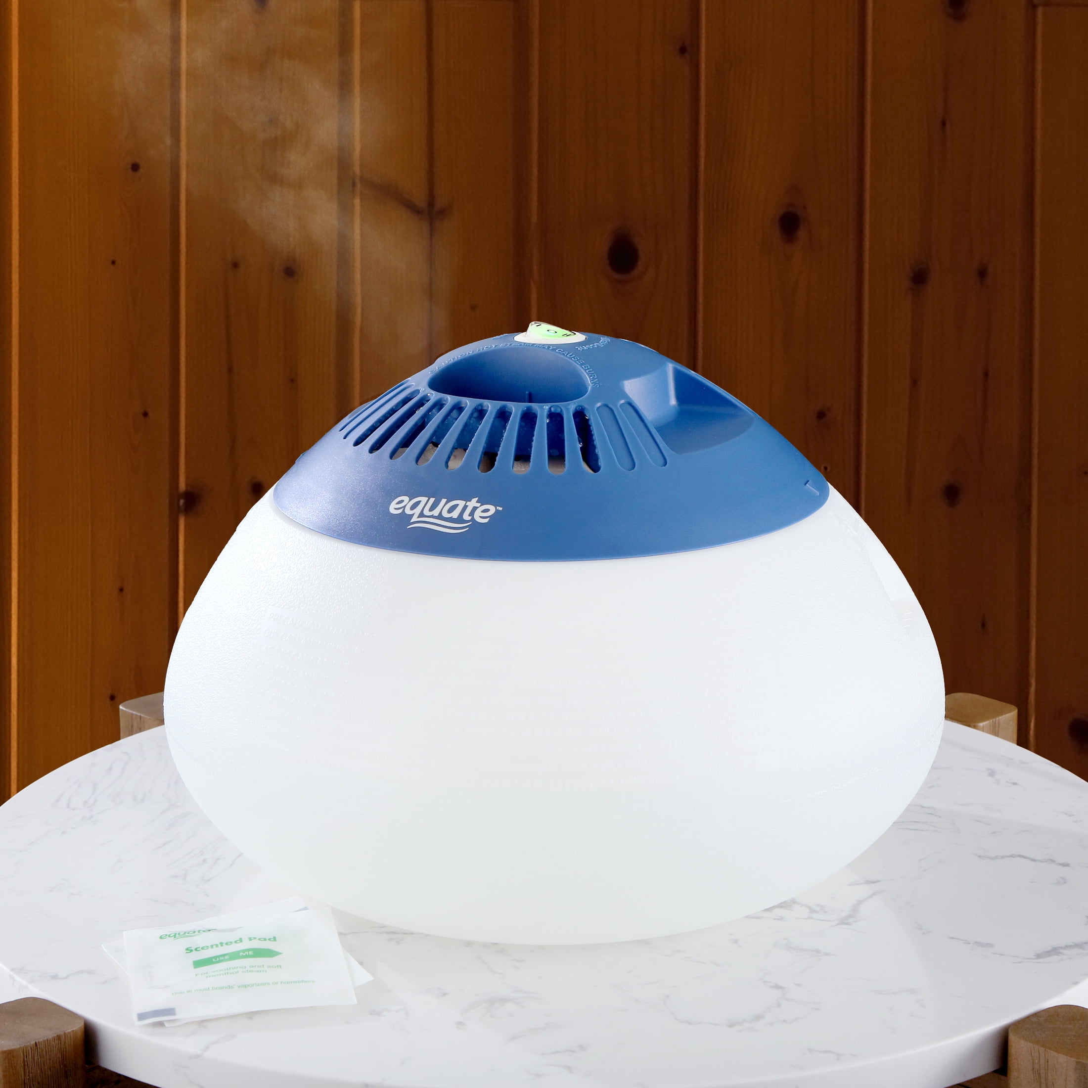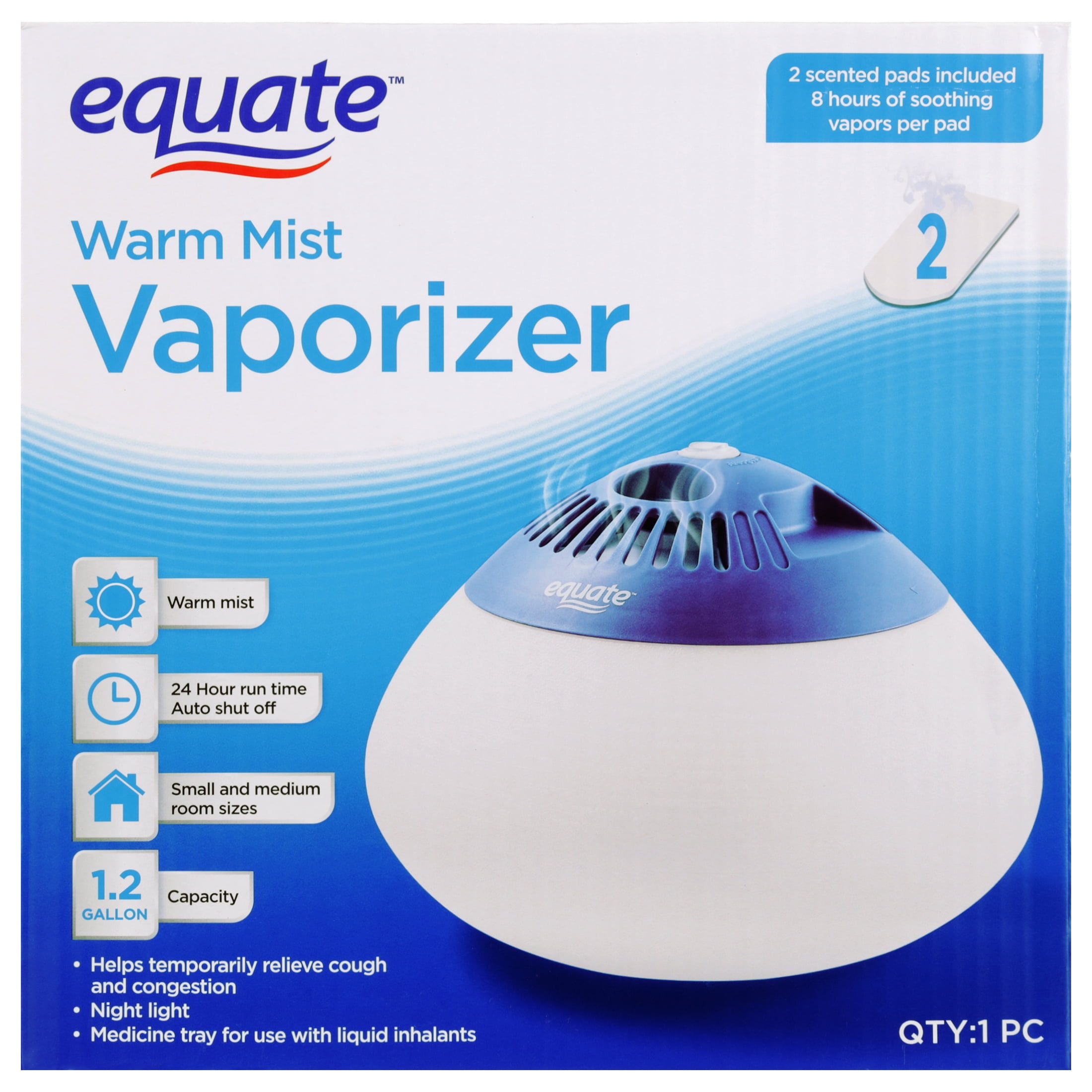 The Equate Warm Mist Vaporizer produces a rich moisture mist. It adds warm moisture to the air which can help to temporarily relieve congestion and cough, reduce static shocks, relieve dry skin, and protect furniture. It has a heating element that boils the water to produce a warm steam. It has a 24 hour run time with an auto shut off providing soothing comfort when you need it. The built-in nightlight adds ambiance and lighting. And you can also drop the inhalants into its medicine tray or insert the Equate Scented Pads into the scented box to enjoy an aromatic moment. Bring home the Equate Warm Mist Vaporizer.