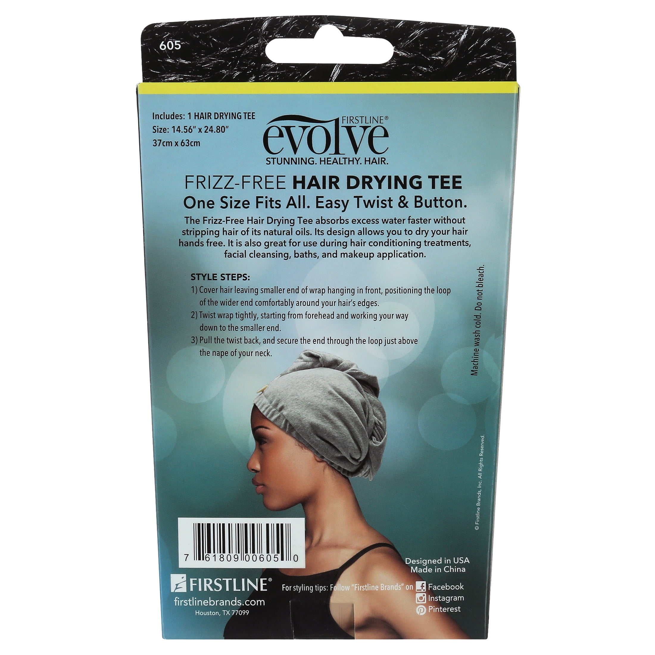 Designed in grey with an easy twist and button, the Frizz-Free Hair Drying Tee absorbs excess water faster without damaging frizz-prone hair. Also promotes optimal hair health.