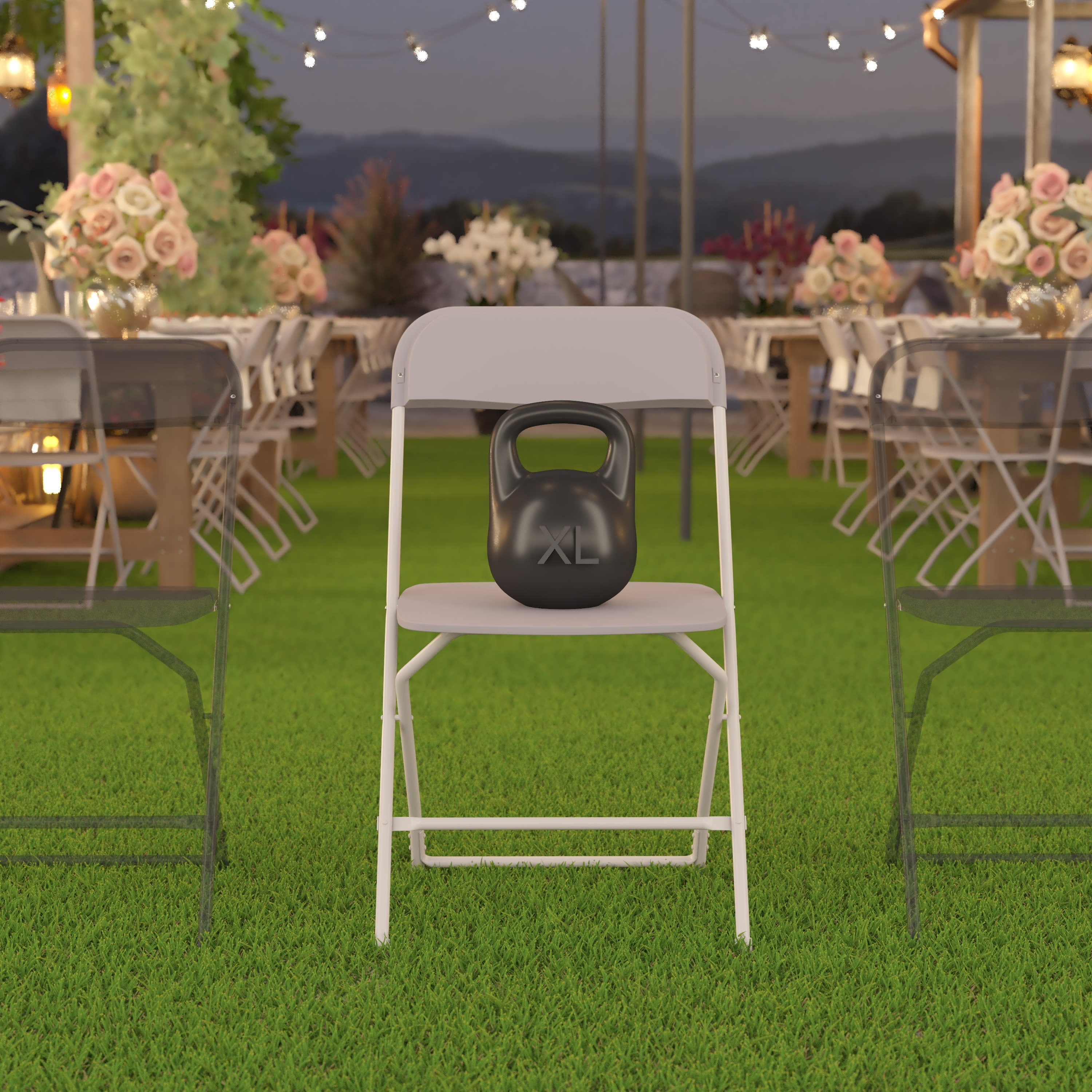 Durably constructed and built to last, the reinforced steel frame along with the high impact plastic back and seat hold up to 650 lbs. static weight while non-marring floor caps protect your indoor flooring surfaces from scuffs and scrapes. The nesting design allows you to stack these party and event chairs up to 50 high from the floor or can be paired with our chair dolly for convenient storage and transport. With a variety of color options, this high capacity foldable chair is ideal for weddings, school functions, barbecues, game night, and catering events.